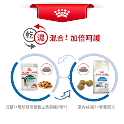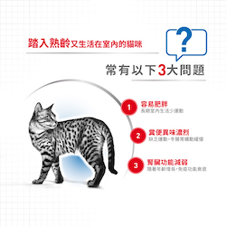 - 幫助7歲以上的貓應對老齡化的初期表現,並幫助貓保持活力,室內生活7歲以上貓糧配方含適量均衡的維生素和礦物質。配方含綠茶多酚,維生素C,EPA和DHA等特定營養素。