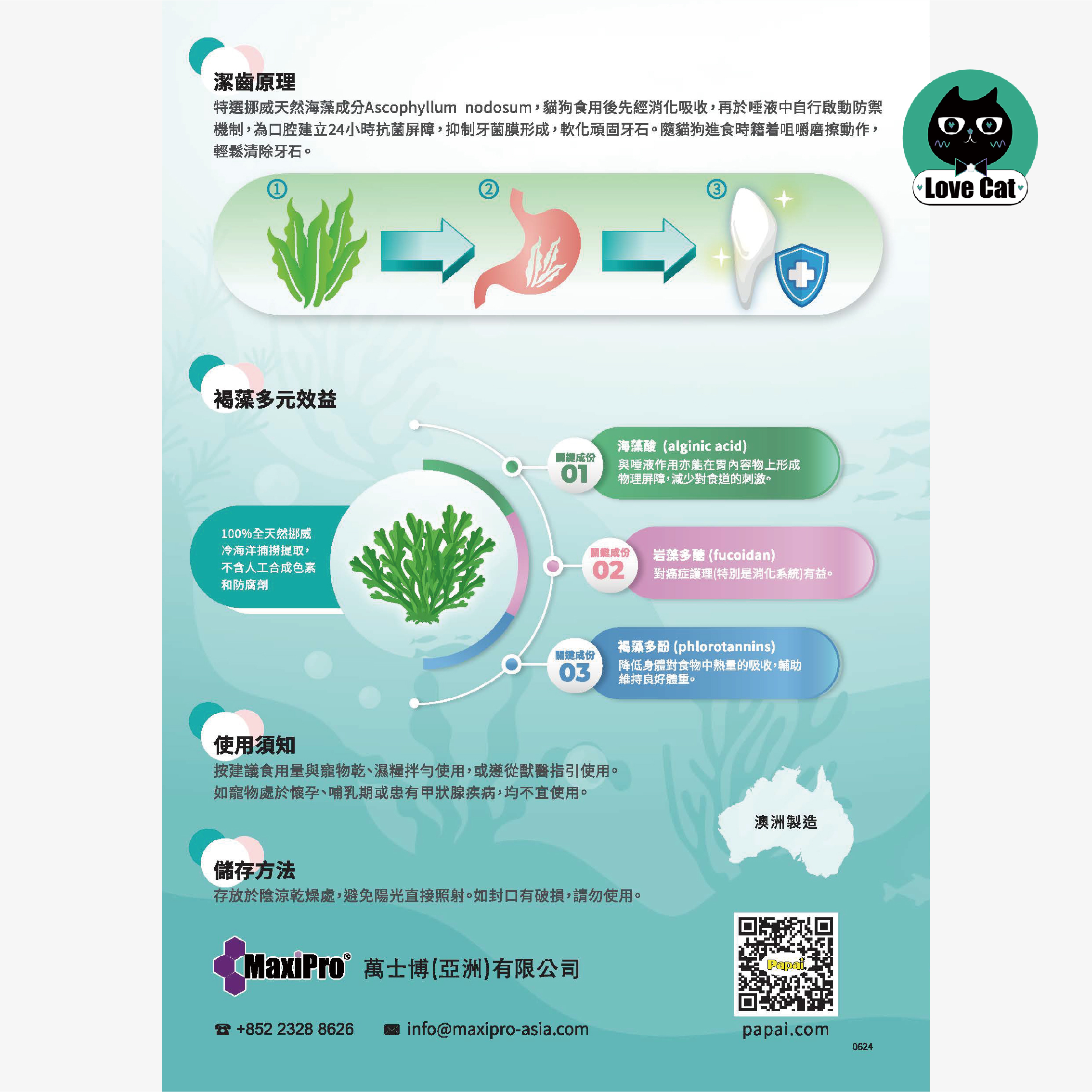 - 使用獲醫學證實,有效改善貓狗口腔健康,軟化和預防牙石的北歐褐藻(Ascophyllum nodosum)。
