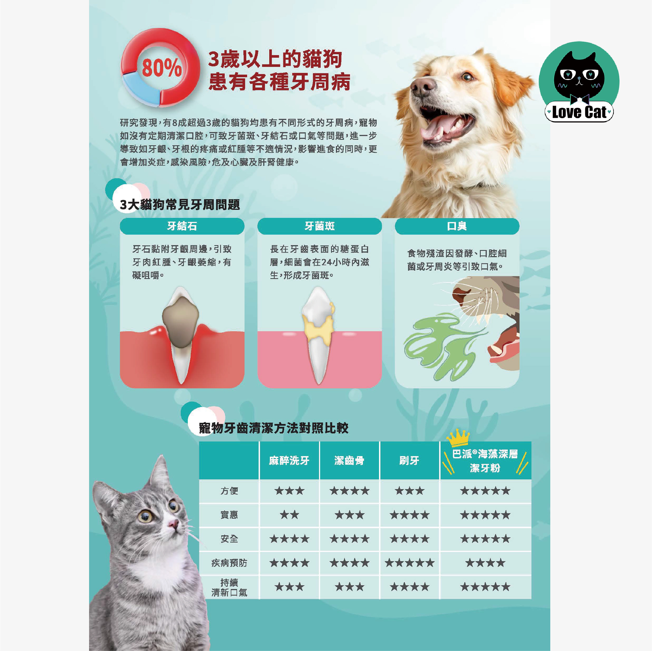 - 攝取北歐褐藻的貓狗,口腔健康會快速著改善,有效減少唾液異味,口氣,牙菌斑和牙石積累。同時有助於結合並排出有毒重金屬,減少貓狗體內毒素。