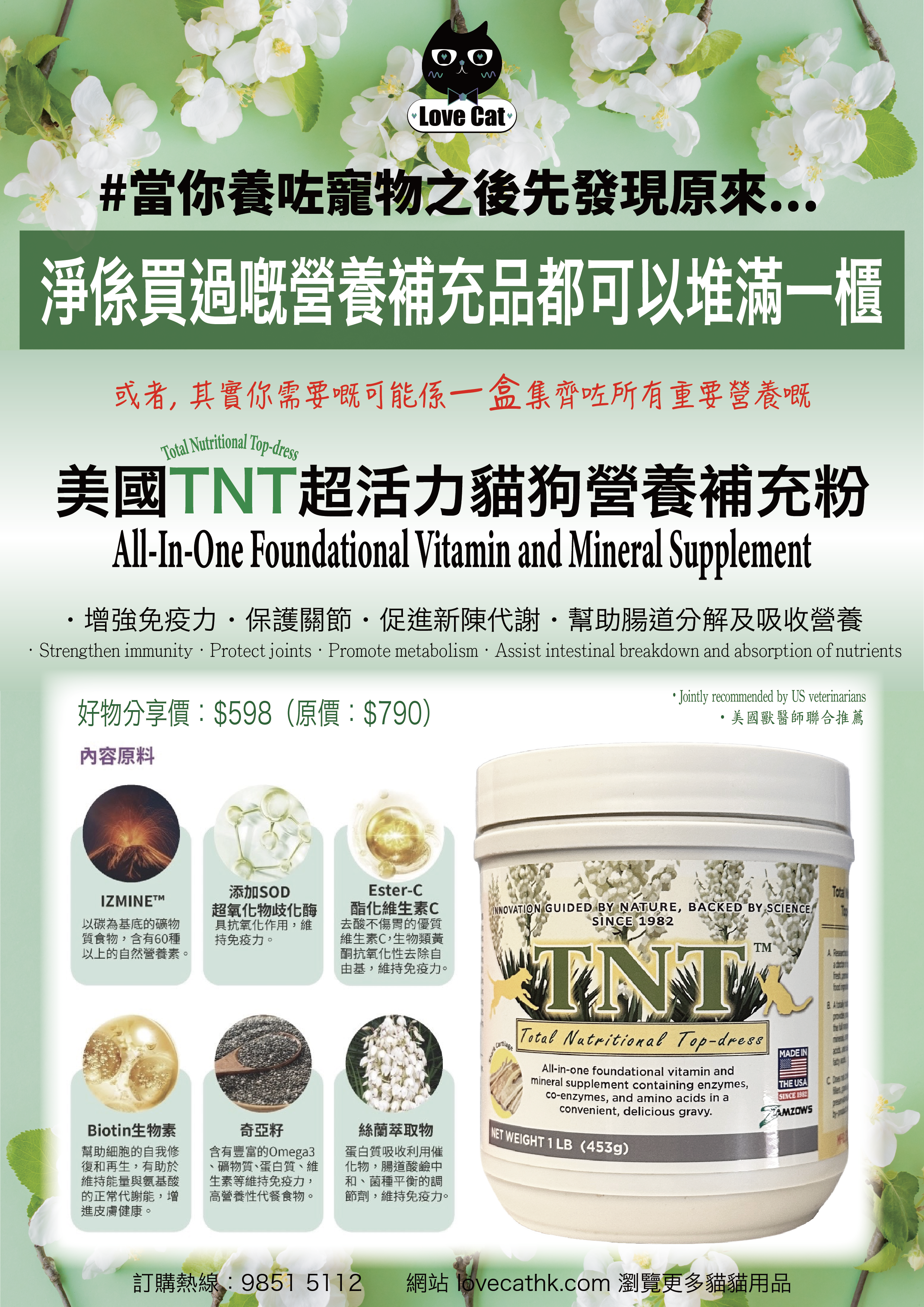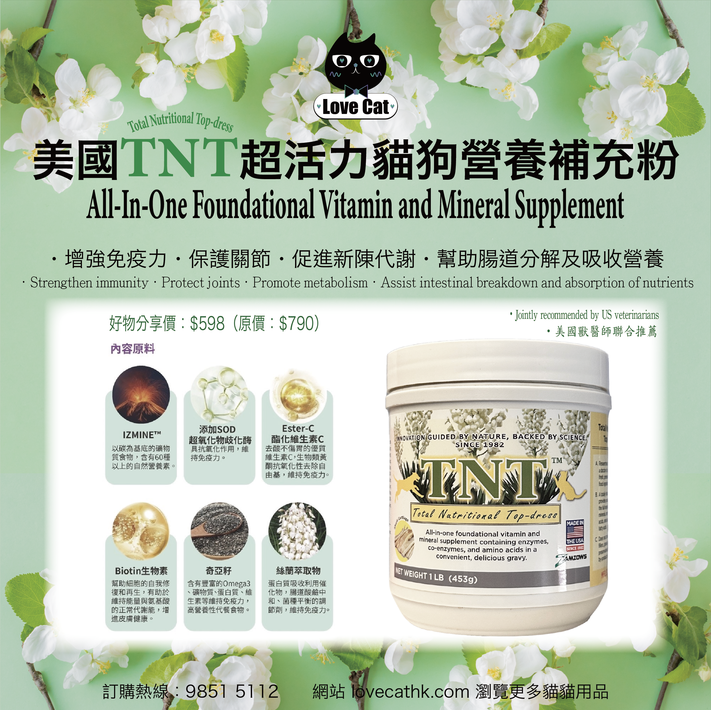 作為5隻貓咪嘅主人,好希望照顧到每一個小朋友嘅營養需要,但不知不覺原來屋企已經擺咗十幾罐唔同功效嘅營養品係度,啲瓶瓶罐罐幾乎霸佔咗成格櫃,其實每餐要餵幾款都已經搞到手忙腳亂。最近俾我搵到呢款 美國TNT超活力貓狗營養補充粉(1磅/453g), 一盒就集齊曬大部分貓狗所需營養。