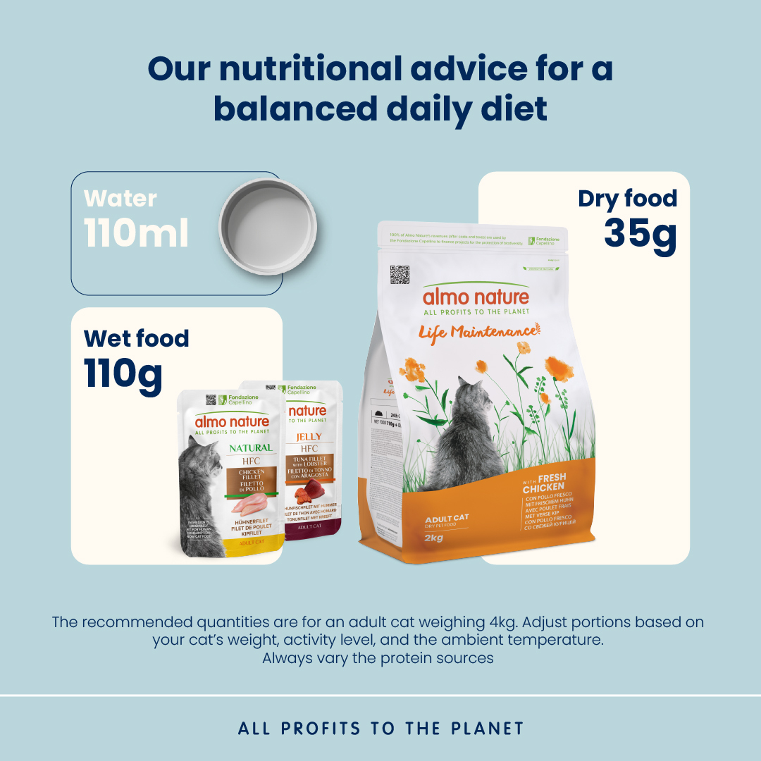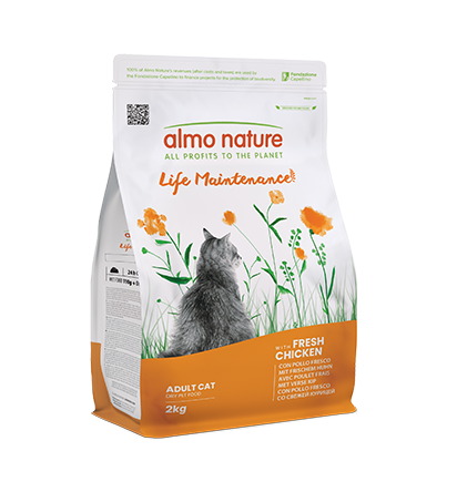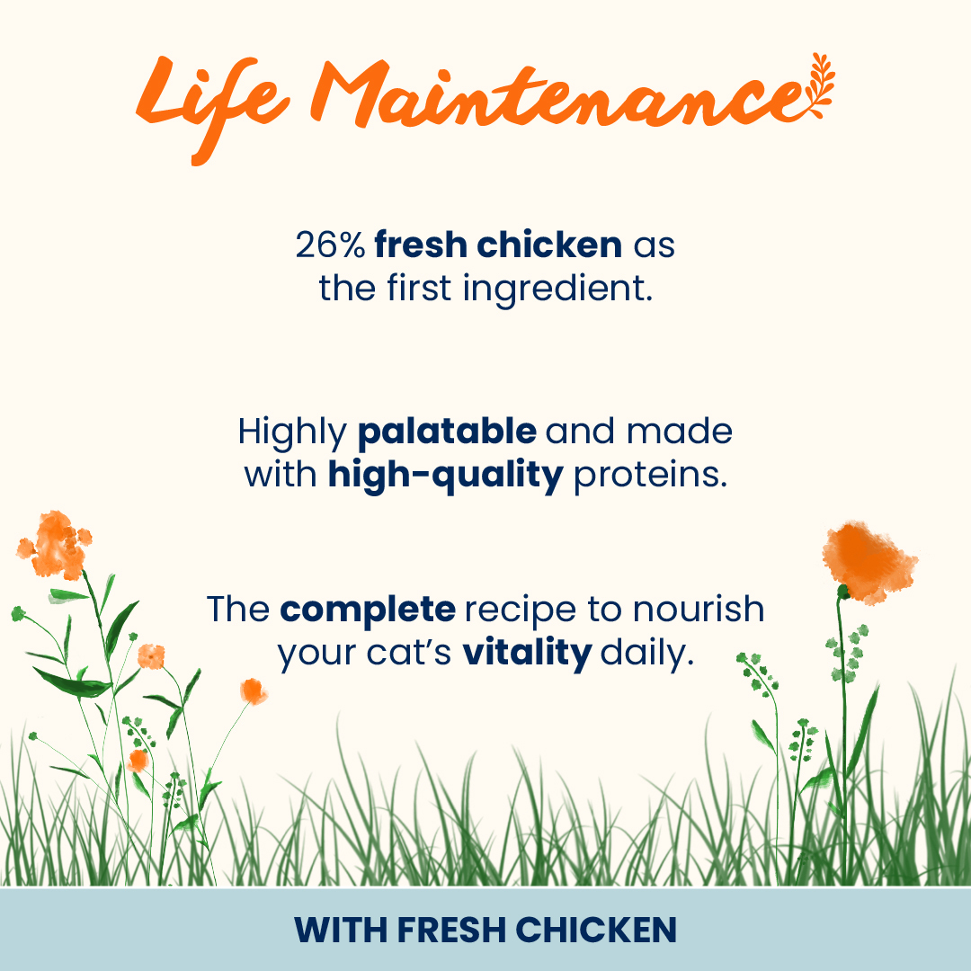 chicken 46% (fresh chicken 26%, dried chicken 20%), maize*, rice, brown rice flour, hydrolysed animal proteins, chicken fat, dried beef 1,3%, minerals, mannanoligosaccharides 0,1%, inulin from chicory - a source of FOS- 0,1%.