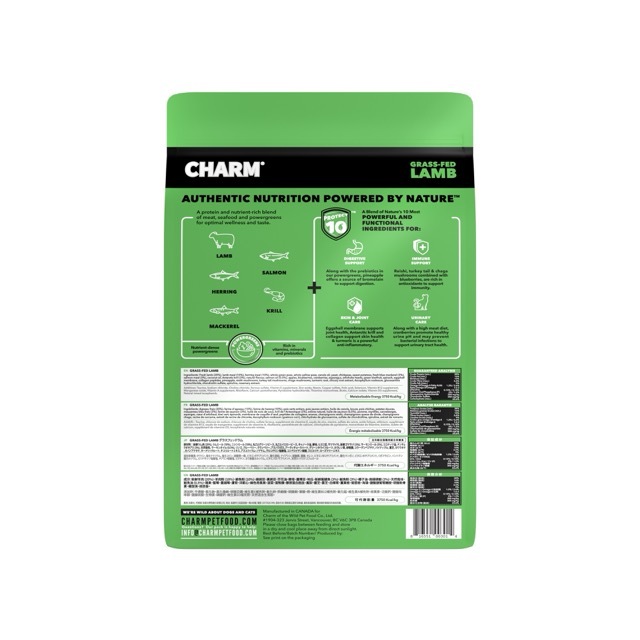 成分:新鮮羊肉 (20%)、羊肉粉 (10%)、鯡魚粉 (10%)、綠豌豆、黃豌豆、芥花油、酵母、鷹嘴豆、地瓜、新鮮藍鯖魚 (3%)、鮭魚粉 (3%)、椰子油、南極磷蝦 (3%)、天然風味、鮭魚油 (0.5%)、蘋果、藍莓、蔓越莓、蘆筍、洋薊心、綠色奇異果、菠菜、蛋殼膜、膠原蛋白胜肽、鳳梨、靈芝、雲芝、白樺茸、薑黃根、菊苣根、海藻、鹽酸鹽葡萄糖胺、硫酸軟骨素、螺旋藻、迷迭香。