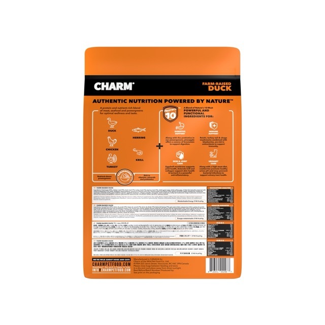 成分:新鮮鴨肉 (20%)、雞肉粉 (9%)、鴨肉粉 (7%)、火雞肉粉 (7%)、鯡魚粉 (7%)、綠豌豆、黃豌豆、雞脂肪(以混合生育酚天然保存) (7%)、酵母、鷹嘴豆、地瓜、椰子油、南極磷蝦 (3%)、天然雞肝風味 (3%)、鮭魚油 (0.5%)、蘋果、藍莓、蔓越莓、蘆筍、洋薊心、綠色奇異果、菠菜、蛋殼膜、膠原蛋白胜肽、鳳梨、靈芝、雲芝、白樺茸、薑黃根、菊苣根、海藻 、鹽酸鹽葡萄糖胺、硫酸軟骨素、螺旋藻、迷迭香。