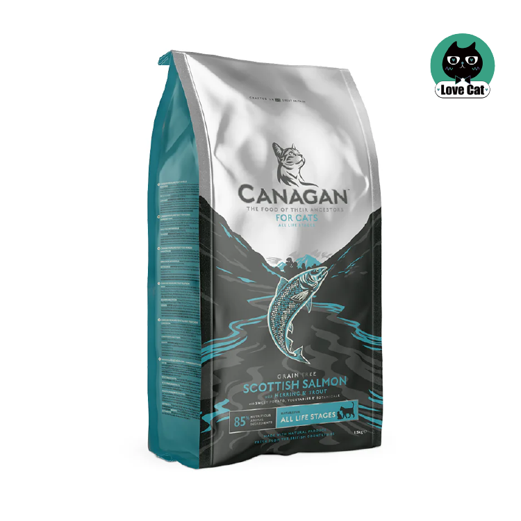 Canagan 貓用無穀物蘇格蘭三文魚配方不含穀物,含超過75%的魚類,提供最佳蛋白質。精心製作,採用新鮮烹製的去骨蘇格蘭三文魚、美味的鯡魚、鱒魚和白魚,以及特選的蔬菜和植物成分。