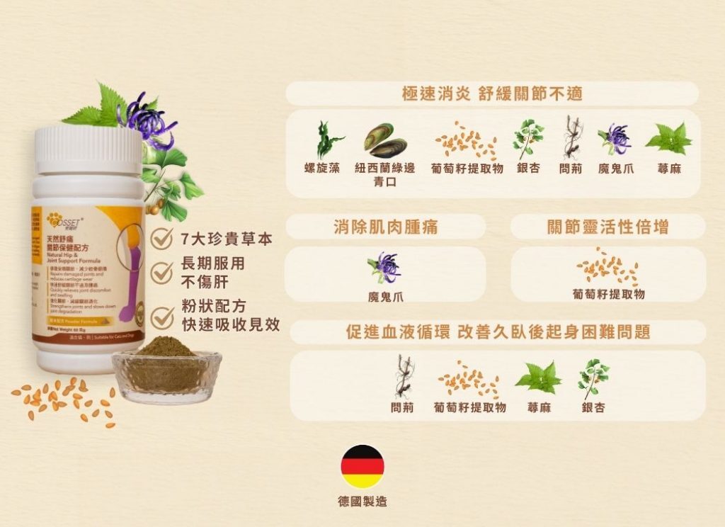有別於傳統貓狗葡萄糖胺配方,產品採出全天然草本成分,能加倍守護貓狗關節健康,長期服用不傷肝。除了常見的貓、狗關節保健配方成分——葡萄糖胺及軟骨素之外,更添加獨有的天然草本,包括魔鬼爪、螺旋藻、問荊和蕁麻等,有助快速舒緩貓貓、狗狗關節炎或者是狗吊腳等關節問題帶來的不適和幫助減輕肌肉腫痛的情況。每天服用,可以幫助減緩貓咪以及狗狗關節的退化速度。