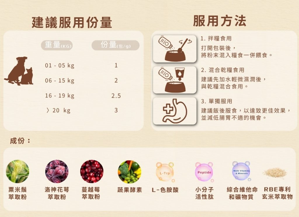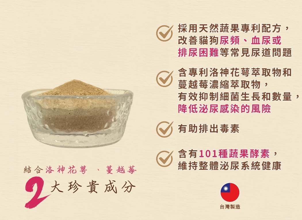 <h5 style='box-sizing: inherit; -webkit-font-smoothing: antialiased; margin-bottom: 15px; border-width: 0px; border-style: initial; font-variant-numeric: inherit; font-variant-east-asian: inherit; font-variant-alternates: inherit; font-variant-position: inherit; font-stretch: inherit; font-size: 13px; line-height: 20px; font-family: Lato, -apple-system, "system-ui", "Segoe UI", Roboto, Oxygen-Sans, Ubuntu, Cantarell, "Helvetica Neue", sans-serif; font-size-adjust: inherit; font-kerning: inherit; font-feature-settings: inherit; vertical-align: baseline; letter-spacing: 3px; color: rgb(102, 104, 31); text-align: start; background-color: rgb(250, 251, 250);'>尿道護理專利配方,採用多種天然食材,包括洛神花萼、蔓越莓及由蔬果、藻類、莓果、穀物等組成的101種蔬果酵素,有助提升泌尿系統健康、幫助排出毒素,並改善貓狗尿頻、血尿或排尿困難等常見尿道問題。</h5><h5 style='box-sizing: inherit; -webkit-font-smoothing: antialiased; border-width: 0px; border-style: initial; font-variant-numeric: inherit; font-variant-east-asian: inherit; font-variant-alternates: inherit; font-variant-position: inherit; font-stretch: inherit; font-size: 13px; line-height: 20px; font-family: Lato, -apple-system, "system-ui", "Segoe UI", Roboto, Oxygen-Sans, Ubuntu, Cantarell, "Helvetica Neue", sans-serif; font-size-adjust: inherit; font-kerning: inherit; font-feature-settings: inherit; vertical-align: baseline; letter-spacing: 3px; color: rgb(102, 104, 31); text-align: start; background-color: rgb(250, 251, 250);'>此配方蘊含的專利洛神花萼萃取物和蔓越莓濃縮萃取物,有效抑制細菌生長和數量,降低泌尿感染的風險。同時額外添加蔬果酵素、小分子活性肽及專利RBE玄米萃取物,幫助維持泌尿系統健康。</h5>