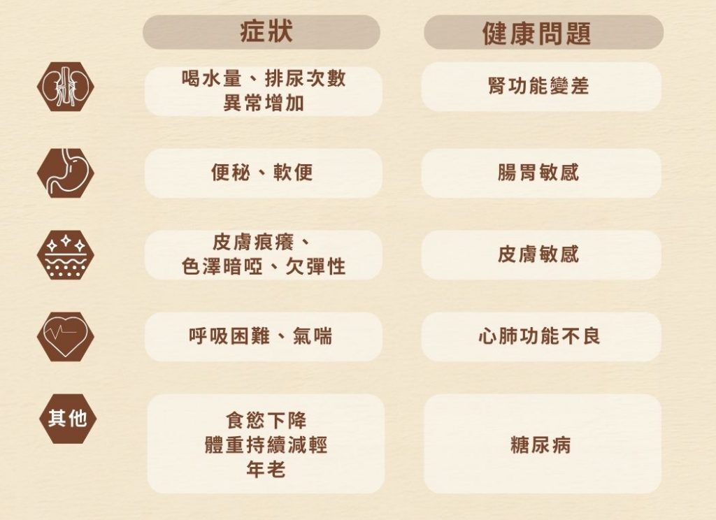 <h5 style="font-variant-alternates: inherit; font-variant-numeric: inherit; font-variant-east-asian: inherit; font-variant-position: inherit; box-sizing: inherit; -webkit-font-smoothing: antialiased; margin-bottom: 15px; border-width: 0px; border-style: initial; font-stretch: inherit; line-height: 20px; font-size-adjust: inherit; font-kerning: inherit; font-feature-settings: inherit; vertical-align: baseline;">喝水量增加、排尿增加、便祕、食慾下降、體重下降。</h5>2. 糖尿問題