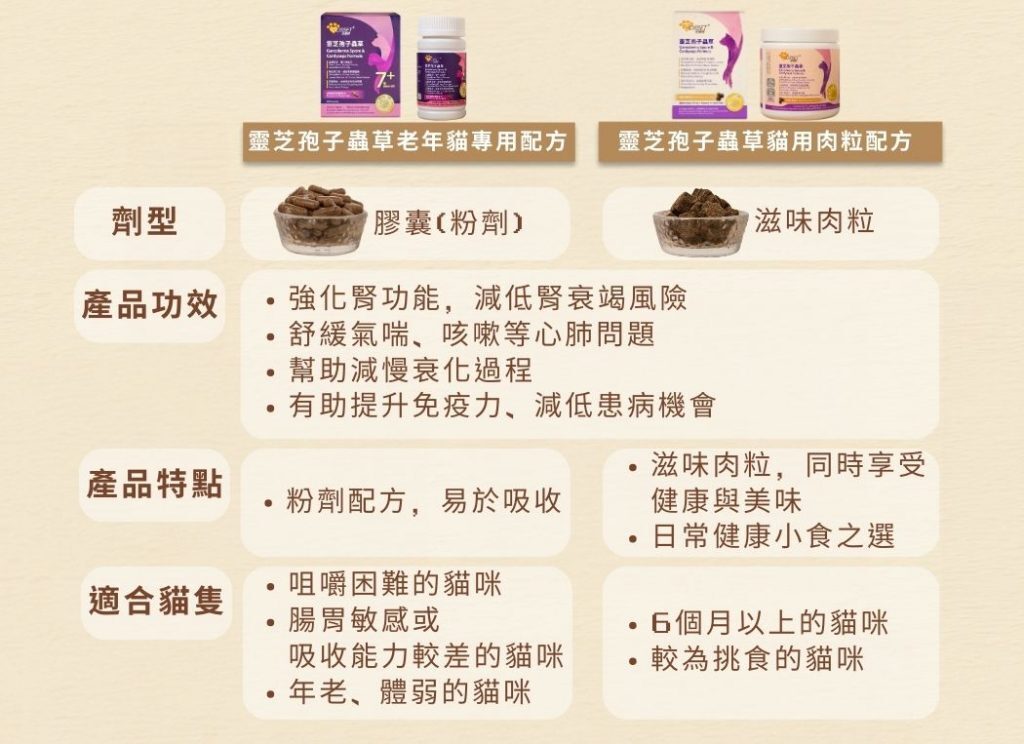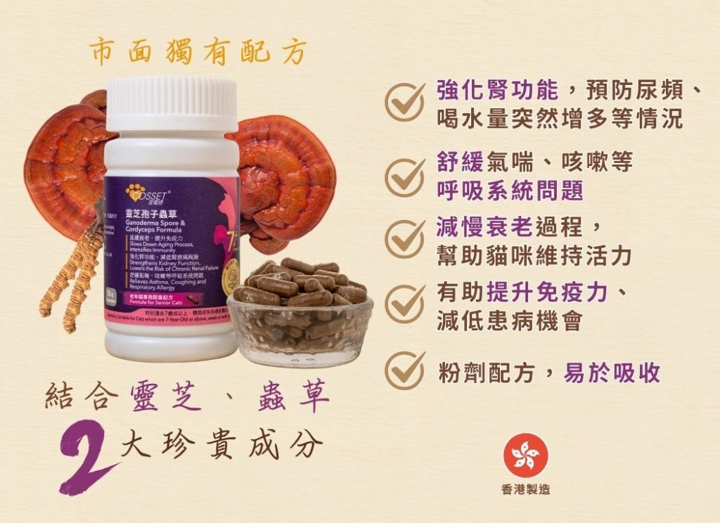 <h5 style="font-variant-alternates: inherit; font-variant-numeric: inherit; font-variant-east-asian: inherit; font-variant-position: inherit; box-sizing: inherit; -webkit-font-smoothing: antialiased; margin-bottom: 15px; border-width: 0px; border-style: initial; font-stretch: inherit; line-height: 20px; font-size-adjust: inherit; font-kerning: inherit; font-feature-settings: inherit; vertical-align: baseline;">放射治療化療會引致貓貓出現食慾下降、體重減少等各種副作用。</h5><h6 style="font-variant-alternates: inherit; font-variant-numeric: inherit; font-variant-east-asian: inherit; font-variant-position: inherit; box-sizing: inherit; -webkit-font-smoothing: antialiased; margin-bottom: 15px; border-width: 0px; border-style: initial; font-stretch: inherit; line-height: 19px; font-size-adjust: inherit; font-kerning: inherit; font-feature-settings: inherit; vertical-align: baseline;">*預防勝於治療,當出現上述病癥,嚴重時可能導致不可逆的傷害。建議發現問題時,立刻諮詢您的獸醫師,並給予最佳的治療計畫。</h6>產品特點 —為甚麼你應該選擇愛寵健靈芝孢子蟲草老年貓專用配方?