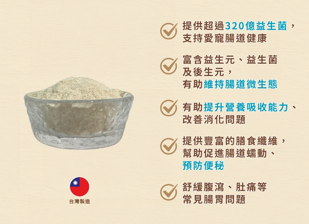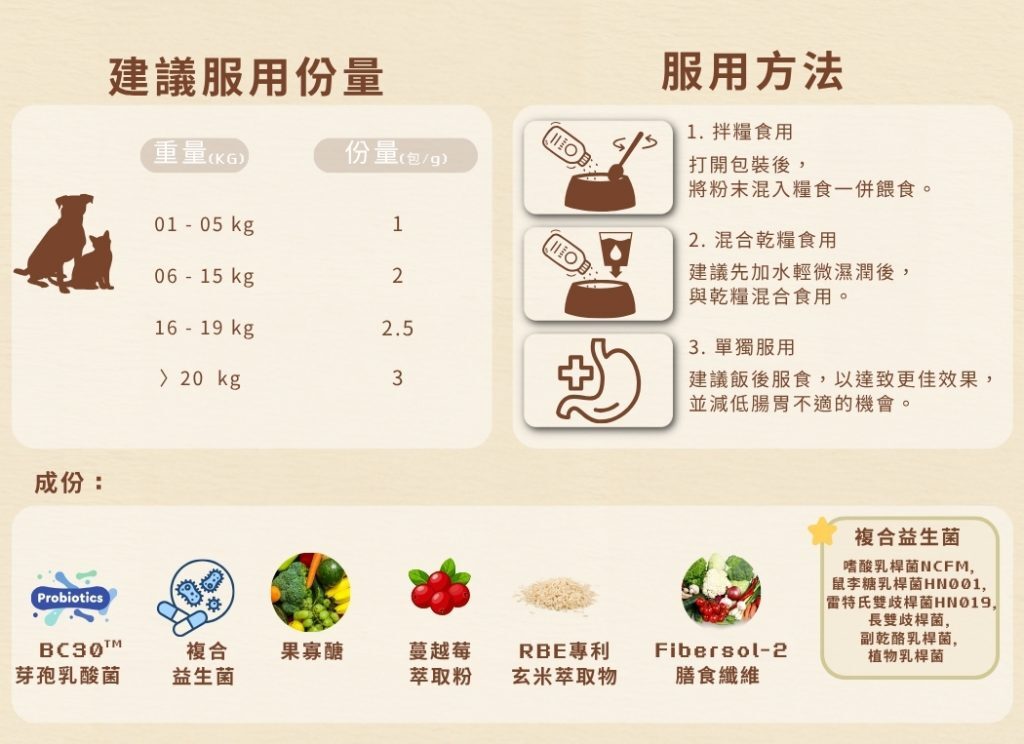 <h5 style='box-sizing: inherit; -webkit-font-smoothing: antialiased; margin-bottom: 15px; border-width: 0px; border-style: initial; font-style: inherit; font-variant: inherit; font-stretch: inherit; font-size: 13px; line-height: 20px; font-family: Lato, -apple-system, BlinkMacSystemFont, "Segoe UI", Roboto, Oxygen-Sans, Ubuntu, Cantarell, "Helvetica Neue", sans-serif; font-size-adjust: inherit; font-kerning: inherit; font-feature-settings: inherit; vertical-align: baseline; letter-spacing: 3px; color: rgb(102, 104, 31);'>專利BC30™ 芽孢乳酸菌及6重複合益生菌,提供超過320億益生菌,支持愛寵腸道健康。此產品富含益生元、益生菌及後生元,有助維持腸道微生態、提升消化力。</h5><h5 style='box-sizing: inherit; -webkit-font-smoothing: antialiased; border-width: 0px; border-style: initial; font-style: inherit; font-variant: inherit; font-stretch: inherit; font-size: 13px; line-height: 20px; font-family: Lato, -apple-system, BlinkMacSystemFont, "Segoe UI", Roboto, Oxygen-Sans, Ubuntu, Cantarell, "Helvetica Neue", sans-serif; font-size-adjust: inherit; font-kerning: inherit; font-feature-settings: inherit; vertical-align: baseline; letter-spacing: 3px; color: rgb(102, 104, 31);'>另外,配方採用的專利RBE玄米萃取物、果寡醣及Fibersol-2 膳食纖維,有助提升營養吸收能力、舒緩腹瀉等常見腸胃問題,並提供豐富的膳食纖維,幫助促進腸道蠕動和預防便秘。</h5>產品成分