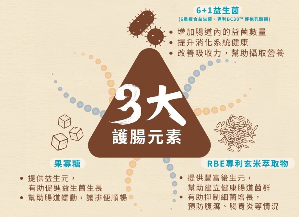 <h5 style='box-sizing: inherit; -webkit-font-smoothing: antialiased; margin-bottom: 15px; border-width: 0px; border-style: initial; font-variant-numeric: inherit; font-variant-east-asian: inherit; font-variant-alternates: inherit; font-variant-position: inherit; font-stretch: inherit; font-size: 13px; line-height: 20px; font-family: Lato, -apple-system, "system-ui", "Segoe UI", Roboto, Oxygen-Sans, Ubuntu, Cantarell, "Helvetica Neue", sans-serif; font-size-adjust: inherit; font-kerning: inherit; font-feature-settings: inherit; vertical-align: baseline; letter-spacing: 3px; color: rgb(102, 104, 31); text-align: start;'>BC30™ 芽孢乳酸菌、複合益生菌 (嗜酸乳桿菌NCFM, 鼠李糖乳桿菌HN001, 雷特氏雙歧桿菌HN019, 長雙歧桿菌, 副乾酪乳桿菌, 植物乳桿菌)、果寡醣、專利RBE玄米萃取物、Fibersol-2 膳食纖維</h5>有效活性成分 (1g)