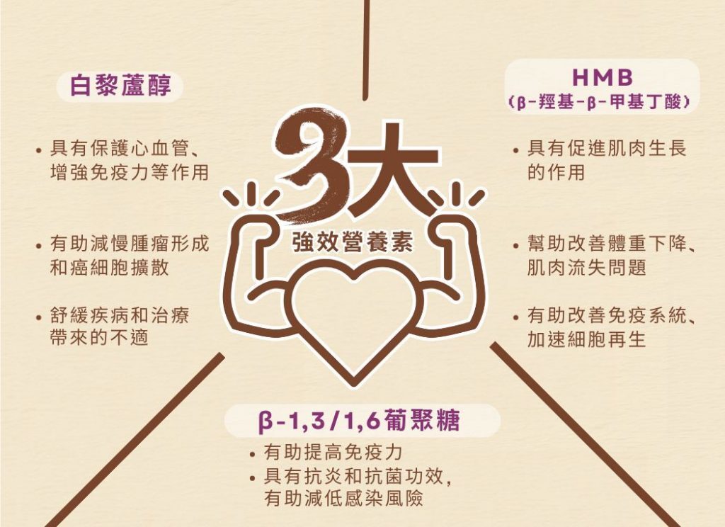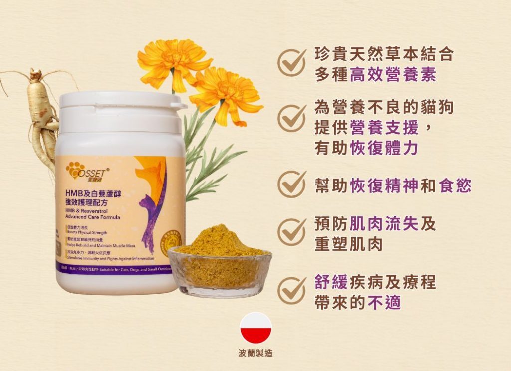 | HMB (β-羥基-β-甲基丁酸) | 常用於人類營養保健品,有助肌肉生長和維持肌肉量,減輕治療期間毛孩活動量下降引致的肌肉、體力流失情況,幫助毛孩保持活力 |