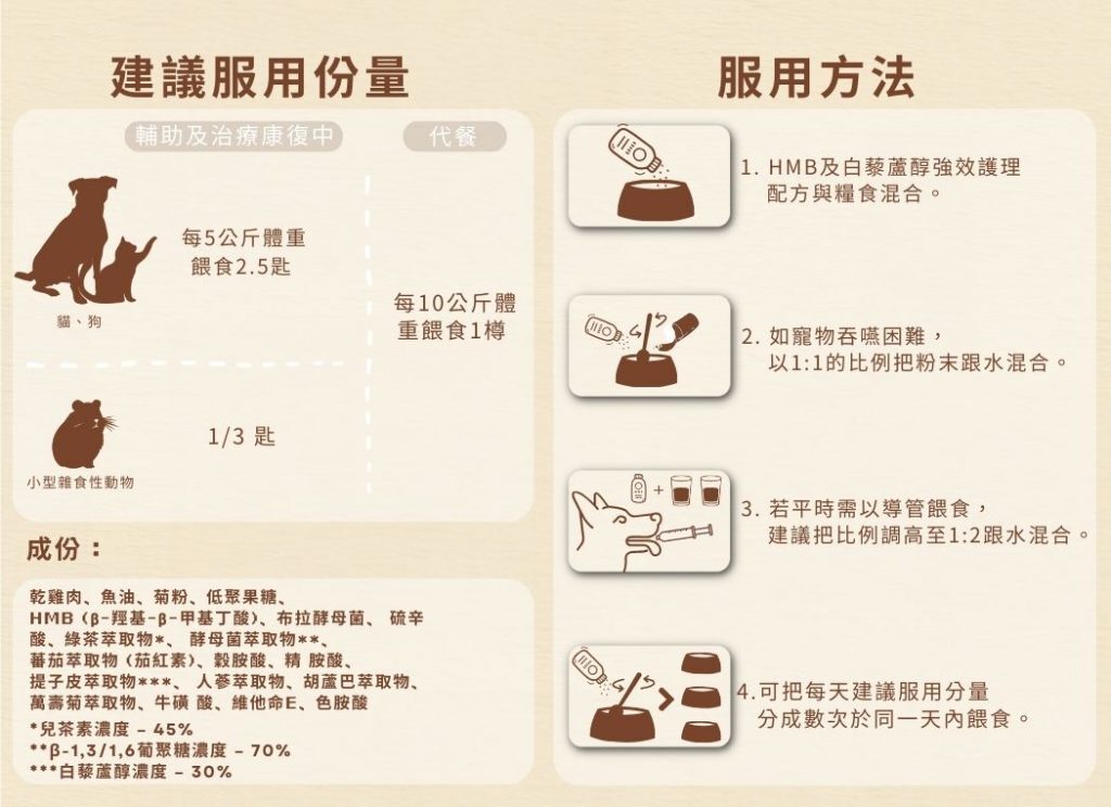 選用人蔘、胡蘆巴和萬壽菊多款珍貴天然食材,並結合白藜蘆醇、HMB等營養素,能幫助因患有腹膜炎、腎病、腸胃炎等疾病的貓狗,以及正在進行治或康復中的毛孩提供營養支援、恢復體力,對抗病魔。多種珍貴食材能全方位幫助愛寵保持充足體力、改善精神狀況、提升免疫力及舒緩治療時帶來的不適。此產品特別適合患有頑疾、手術後及治療期間的毛孩服用。