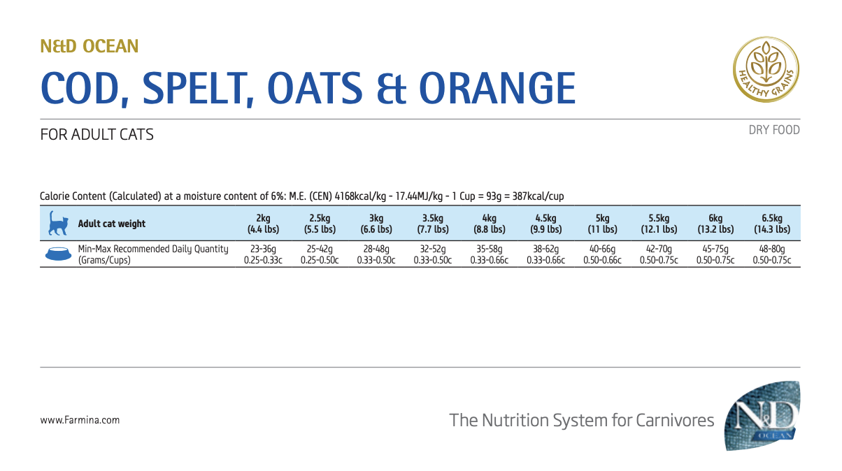鱈魚(27%)、脫水鱈魚(26%)、鯡魚油、斯佩爾特小麥(10%)、燕麥(10%)、乾燥甜菜漿、乾燥胡蘿蔔、苜蓿粉、菊糖、果寡醣、甘露寡醣(萃取自酵母)、乾燥甜橙(0.5%)、乾燥蘋果、乾燥石榴、乾燥菠菜、洋車前子殼與種子(0.3%)、乾燥藍莓、氯化鈉、乾燥啤酒酵母、薑黃(0.2%)、蘆薈萃取物