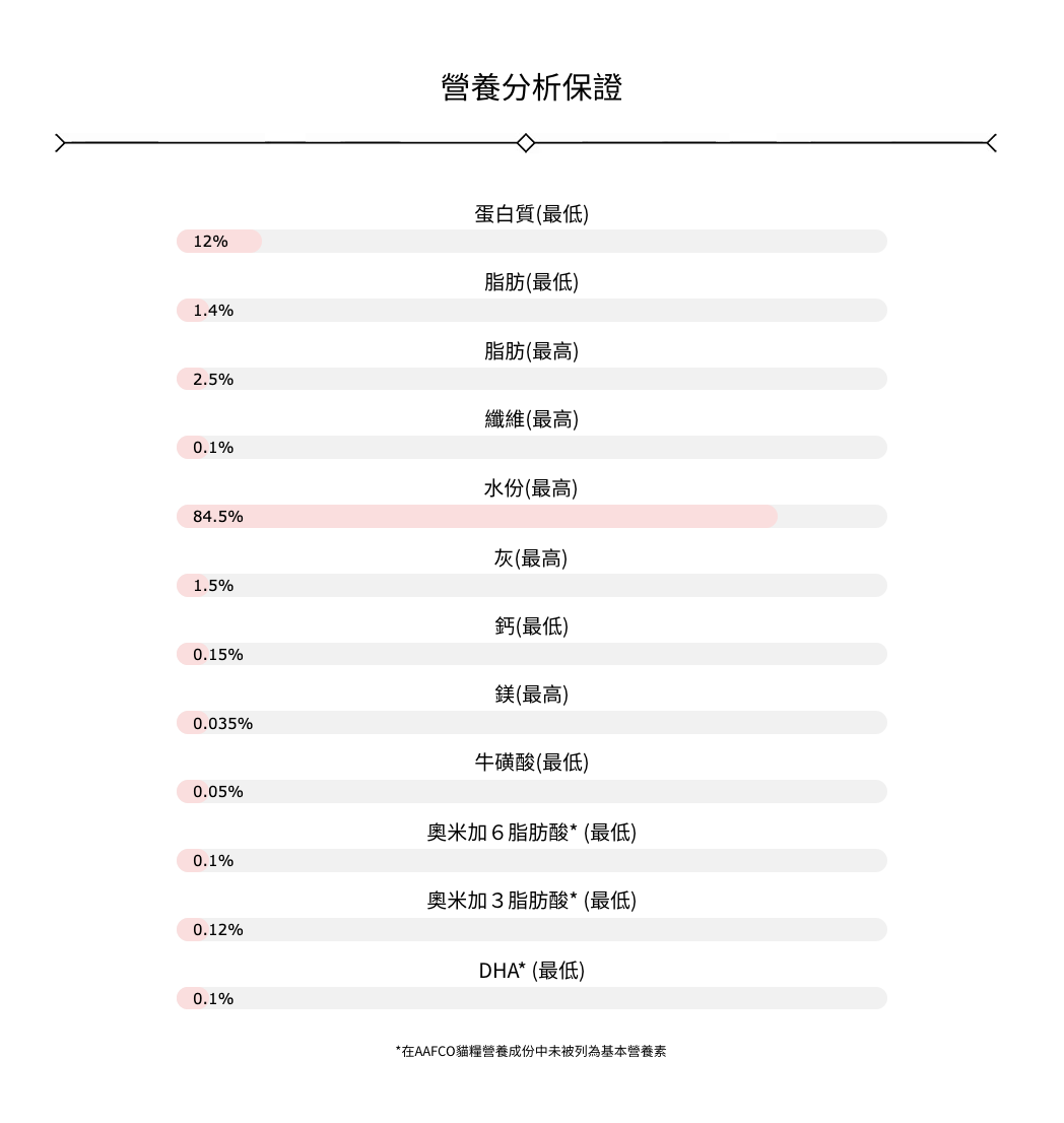 吞拿魚、充足水份、三文魚、葵花籽油、磷酸三鈣、刺槐豆膠、角叉菜膠、瓜爾豆膠、氯化鉀、氯化膽鹼、果寡醣、牛磺酸、硫酸鋅、維他命E補充劑、硫酸亞鐵、硝酸硫胺明(維他命B1來源)、菸鹼酸(維他命B3來源)、泛酸鈣、維他命A補充劑、碘化鉀、硫酸錳、硫酸銅、維他命D3補充劑、核黃素補充劑(維他命B2來源)、鹽酸吡哆辛(維他命B6來源)、葉酸、甲萘醌亞硫酸氫鈉複合物、維他命B12補充劑。