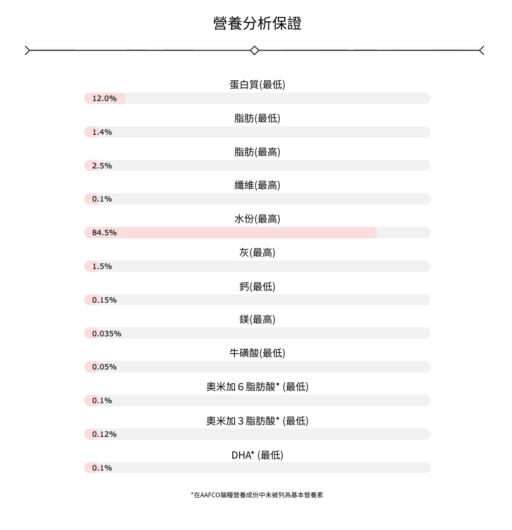 吞拿魚、充足水份、鯷魚、葵花籽油、磷酸三鈣、刺槐豆膠、角叉菜膠、瓜爾豆膠、氯化鉀、氯化膽鹼、果寡醣、牛磺酸、硫酸鋅、維他命E補充劑、硫酸亞鐵、硝酸硫胺明(維他命B1來源)、菸鹼酸(維他命B3來源)、泛酸鈣、維他命A補充劑、碘化鉀、硫酸錳、硫酸銅、維他命D3補充劑、核黃素補充劑(維他命B2來源)、鹽酸吡哆辛(維他命B6來源)、葉酸、甲萘醌亞硫酸氫鈉複合物、維他命B12補充劑。