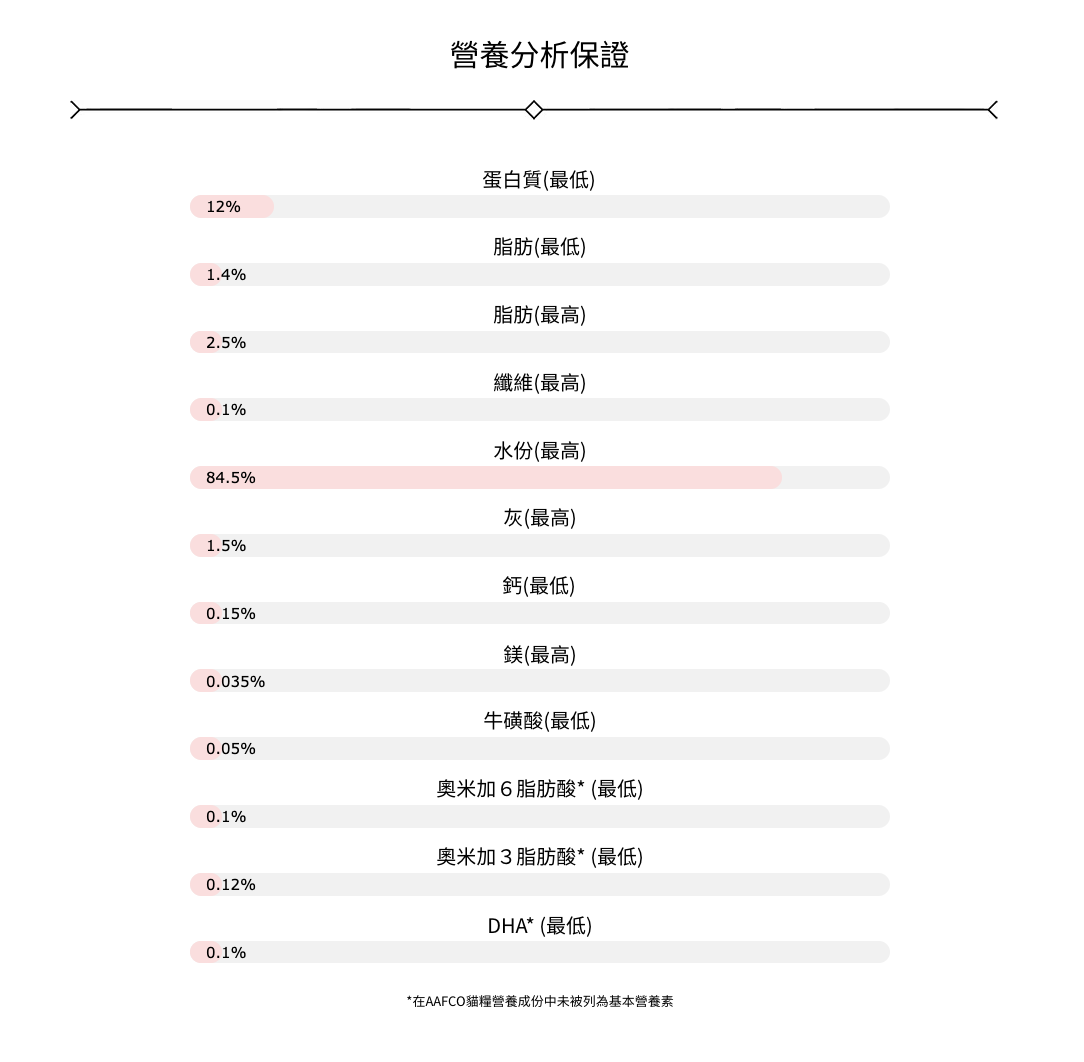 吞拿魚、充足水份、海魚、葵花籽油、磷酸三鈣、刺槐豆膠、角叉菜膠、瓜爾豆膠、氯化鉀、氯化膽鹼、果寡醣、牛磺酸、硫酸鋅、維他命E補充劑、硫酸亞鐵、硝酸硫胺明(維他命B1來源)、菸鹼酸(維他命B3來源)、泛酸鈣、維他命A補充劑、碘化鉀、硫酸錳、硫酸銅、維他命D3補充劑、核黃素補充劑(維他命B2來源)、鹽酸吡哆辛(維他命B6來源)、葉酸、甲萘醌亞硫酸氫鈉複合物、維他命B12補充劑。