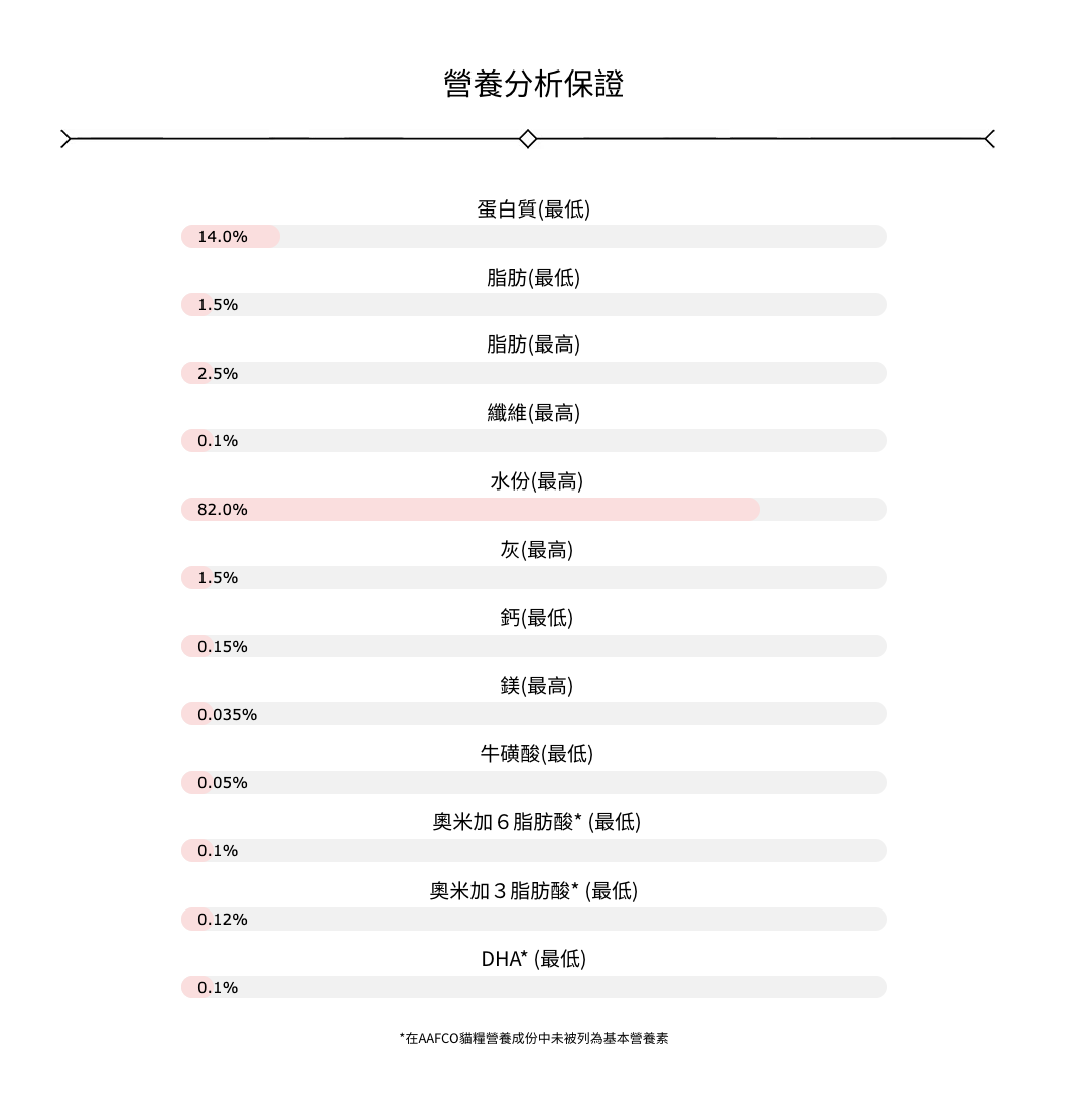 吞拿魚、煙燻吞拿魚、充足水份、角叉菜膠、決明子膠、瓜爾豆膠、葵花籽油、磷酸三鈣、氯化膽鹼、牛磺酸、果寡醣、硫酸鋅、維他命E補充劑、硝酸硫胺明(維他命B1來源)、菸鹼酸(維他命B3來源)、泛酸鈣、碘化鈉、硫酸錳、維他命A補充劑、核黃素補充劑(維他命B2來源)、鹽酸吡哆辛(維他命B6來源)、葉酸、硫酸亞鐵、硫酸銅、甲萘醌亞硫酸氫鈉複合物(維他命K3來源)、維他命D3補充劑、維他命B12補充劑。