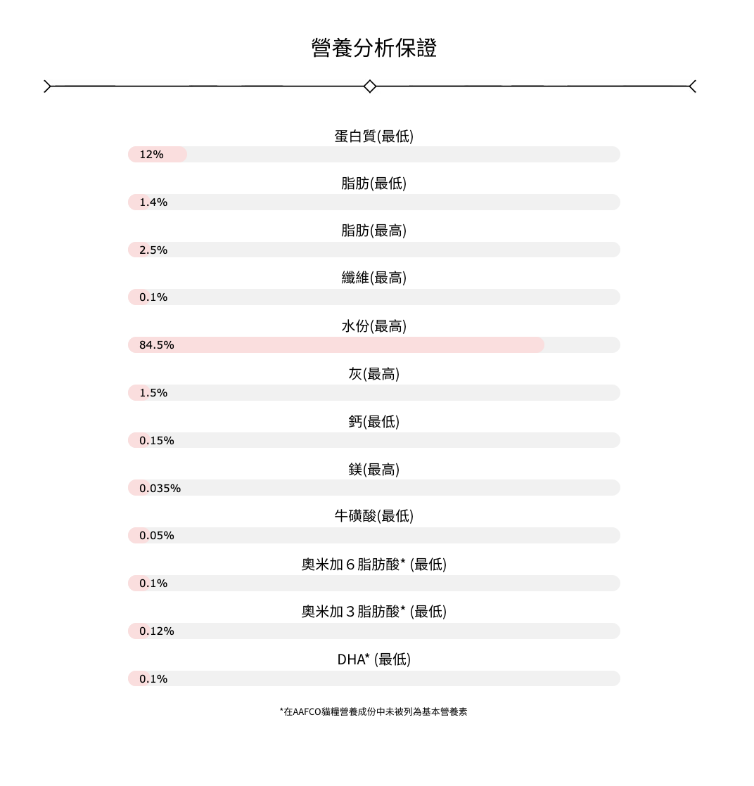 吞拿魚、充足水份、虎蝦、葵花籽油、磷酸三鈣、刺槐豆膠、角叉菜膠、瓜爾豆膠、氯化鉀、氯化膽鹼、果寡醣、牛磺酸、硫酸鋅、維他命E補充劑、硫酸亞鐵、硝酸硫胺明(維他命B1來源)、菸鹼酸(維他命B3來源)、泛酸鈣、維他命A補充劑、碘化鉀、硫酸錳、硫酸銅、維他命D3補充劑、核黃素補充劑(維他命B2來源)、鹽酸吡哆辛(維他命B6來源)、葉酸、甲萘醌亞硫酸氫鈉複合物、維他命B12補充劑。