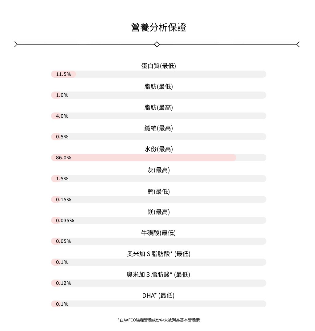 充足水份、吞拿魚、雞肝、角叉菜膠、決明子膠、瓜爾豆膠、葵花籽油、磷酸三鈣、氯化膽鹼、牛磺酸、果寡醣、硫酸鋅、維他命E補充劑、硫酸亞鐵、硝酸硫胺明(維他命B1來源)、菸鹼酸(維他命B3來源)、維他命A補充劑、泛酸鈣、碘化鉀、硫酸錳、核黃素補充劑(維他命B2來源)、鹽酸吡哆辛(維他命B6來源)、甲萘醌亞硫酸氫鈉複合物(維他命K3來源)、維他命D3補充劑、葉酸、硫酸銅、維他命B12補充劑、生物素(維他命H來源)。