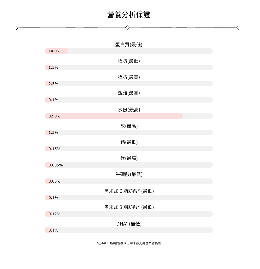 吞拿魚、鯛魚、充足水份、角叉菜膠、決明子膠、瓜爾豆膠、葵花籽油、磷酸三鈣、氯化膽鹼、牛磺酸、果寡醣、硫酸鋅、維他命E補充劑、硝酸硫胺明(維他命B1來源)、菸鹼酸(維他命B3來源)、泛酸鈣、碘化鉀、硫酸錳、維他命A補充劑、核黃素補充劑(維他命B2來源)、鹽酸吡哆辛(維他命B6來源)、葉酸、硫酸亞鐵、硫酸銅、甲萘醌亞硫酸氫鈉複合物(維他命K3來源)、維他命D3補充劑、維他命B12補充劑。