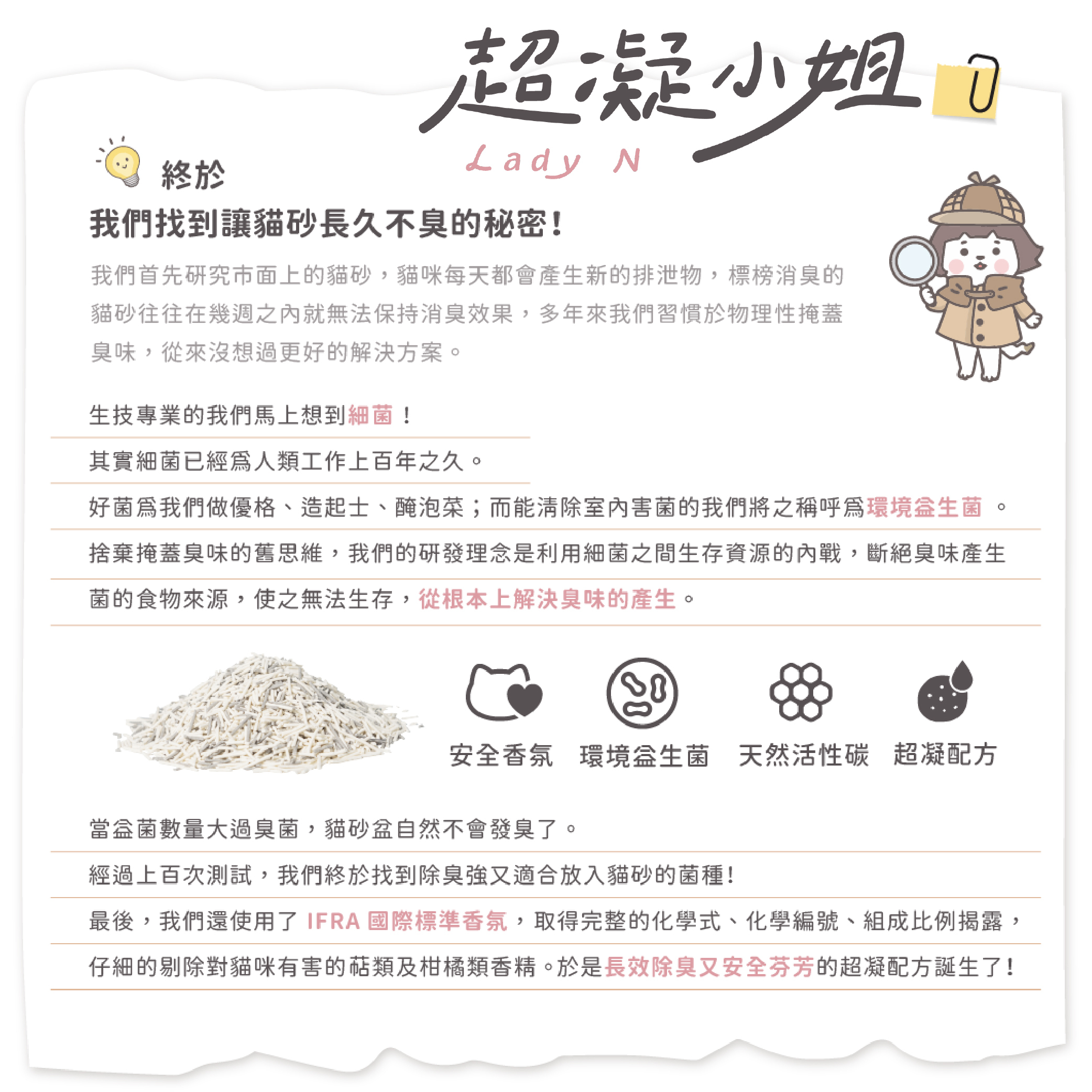 極速凝結:遇水後可在約3 秒內快速凝結成團,不易散開或沾黏。 低粉塵:採用多道除塵技術,粉塵量少,適合對粉塵敏感的貓咪和飼主。 抗潮濕:不容易受潮結塊。 益生菌除臭:能長時間抑制臭味,而不是單純用香氛掩蓋。 安全香氛:採用符合國際香氣協會(IFRA)標準的香氛,對寵物相對安全。 可沖馬桶:遇到水後會快速溶解,部分產品可直接沖入馬桶。 易於清理:因其優良的凝結力,清理時更容易鏟起