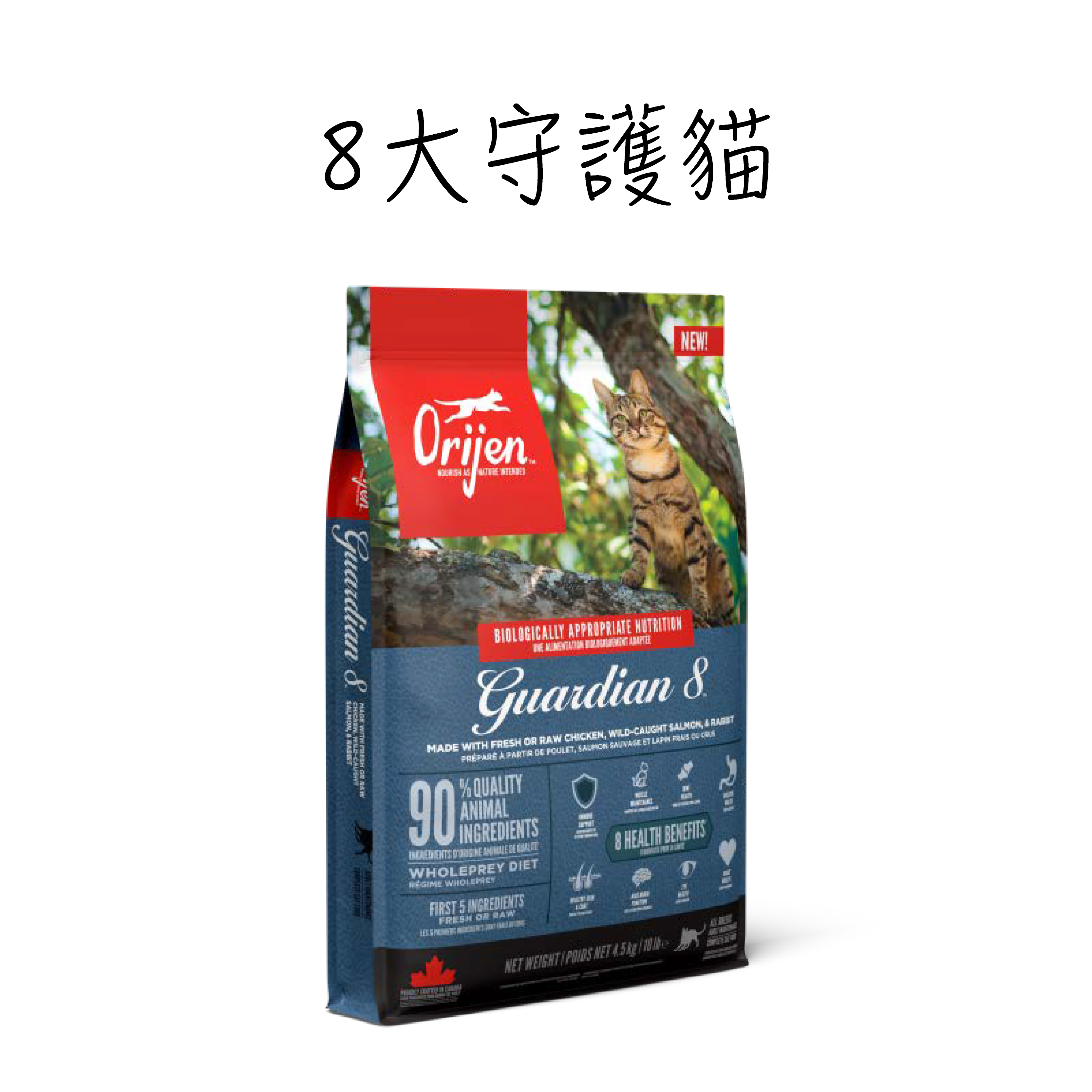 ORIJEN™ Guardian 8™ 八大守護貓糧是利用優質食材,特別為針對 8 種常見的貓隻問題而配製的貓糧。因為這種飲食中含有大量新鮮和凍鮮的完整獵食動物食材,因此只需較少補充品即可支持您愛貓的終生健康。Guardian 8 八大守護貓糧含有營養豐富的食材,當中有 90%* 為頂級動物食材,而 2/3 為鮮肉及凍鮮肉,有助以 8 種好處支持您愛貓的整體健康。這些好處包括免疫系統支持、消化系統健康支持、健康皮膚和皮毛支持、肌肉保養、心臟健康、關節健康、腦及認知功能和眼睛健康。