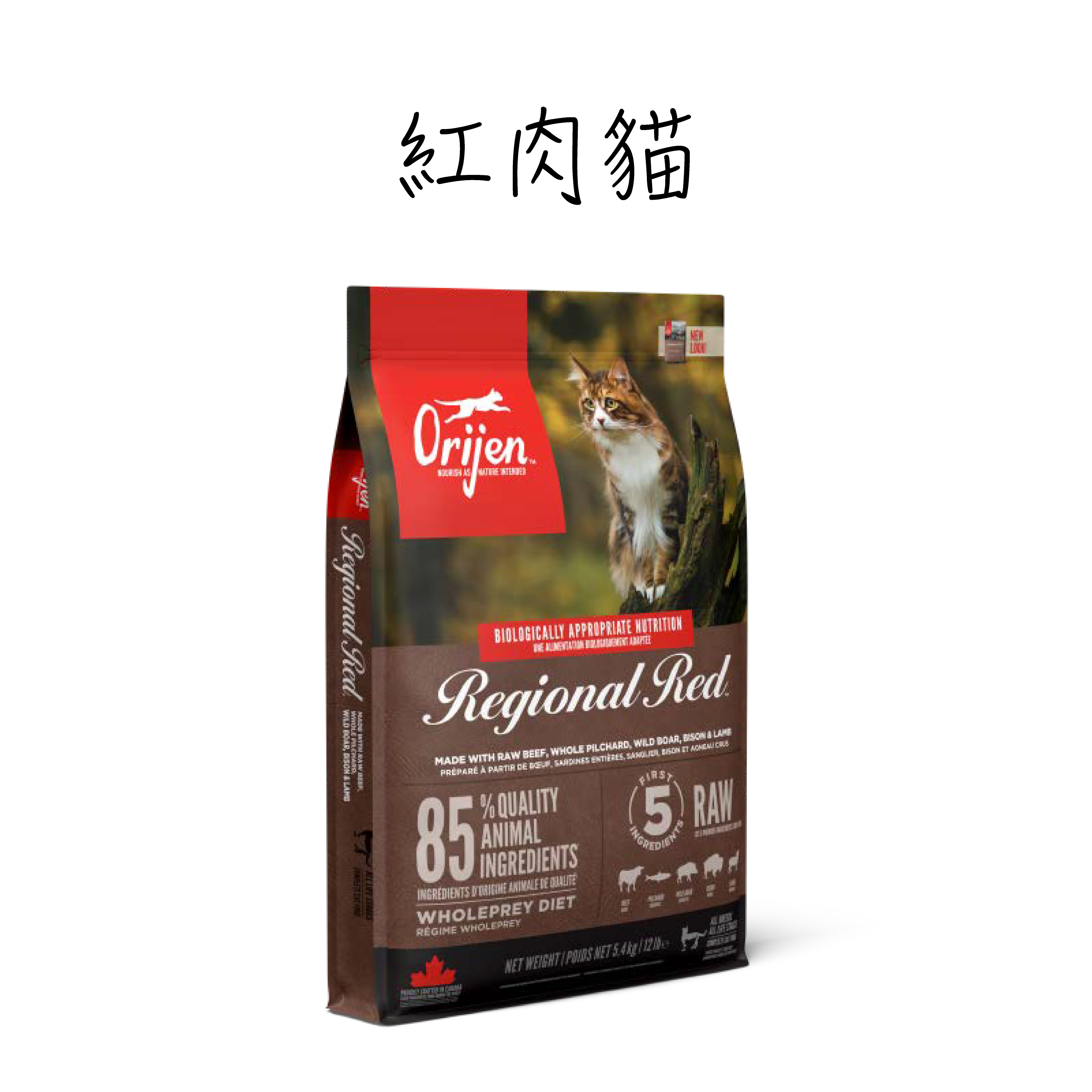ORIJEN 紅肉配方貓糧以生1 牛肉、整條沙甸魚、野豬、野牛和羊肉等肉類製成。ORIJEN 紅肉配方貓糧富含肉類、魚類、內臟和骨頭等完整獵食動物成分,以最營養豐富和獵物最鮮美多汁的部位製作,為貓隻提供所需營養。這種飲食具有 85%2 優質動物成分,外層以凍乾肝臟包裹,實在是無可比擬。