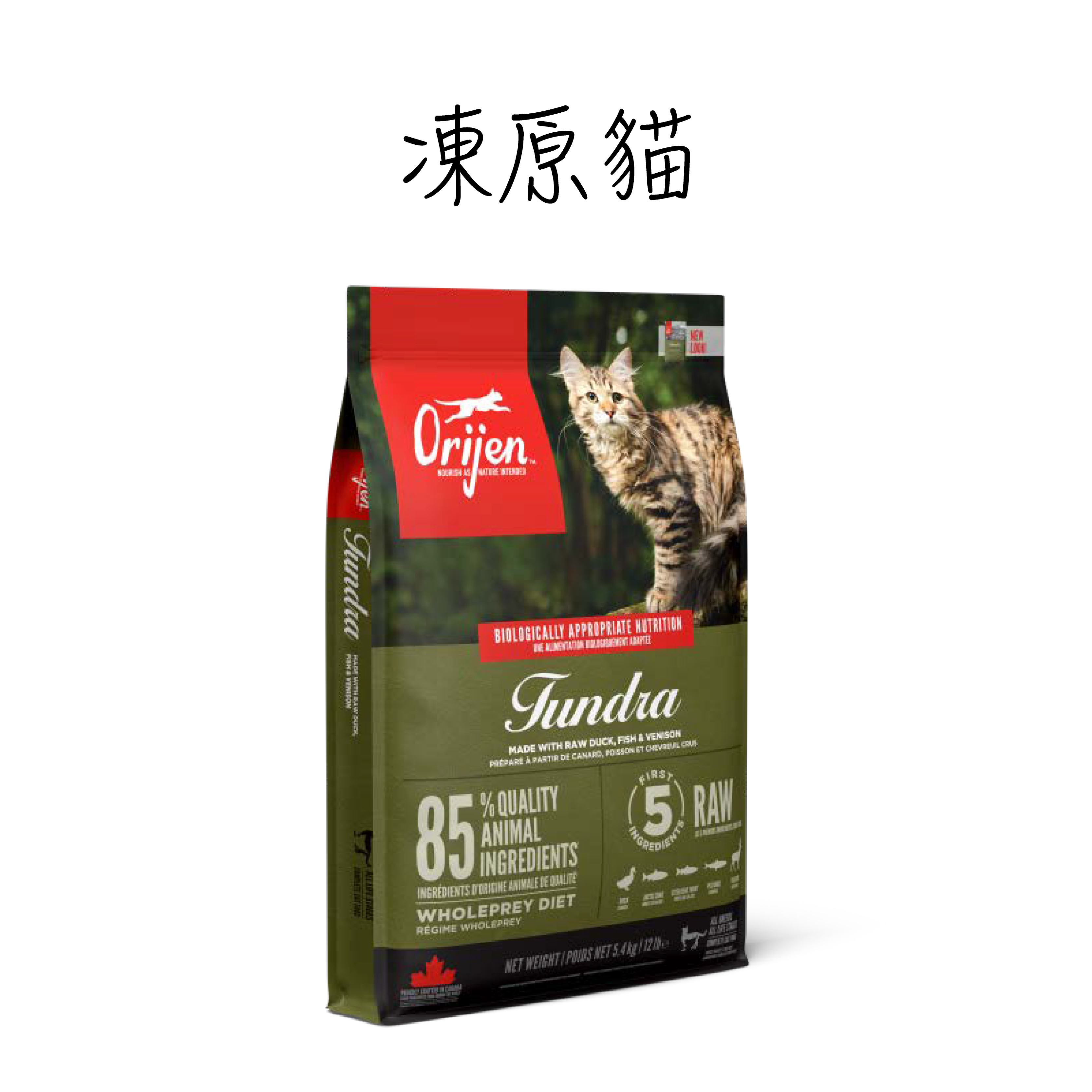 ORIJEN 凍原貓配方貓糧以鴨肉、北極紅點鮭、鋼頭鱒魚、整條沙丁魚和鹿肉等肉類製成。配方富含肉類、魚類、內臟和骨頭等完整獵食動物成分,以最營養豐富和獵物最鮮美多汁的部位製作,為貓隻提供所需營養。這種飲食具有 85%優質動物成分,外層以凍乾肝臟包裹,營養價值無可比擬。