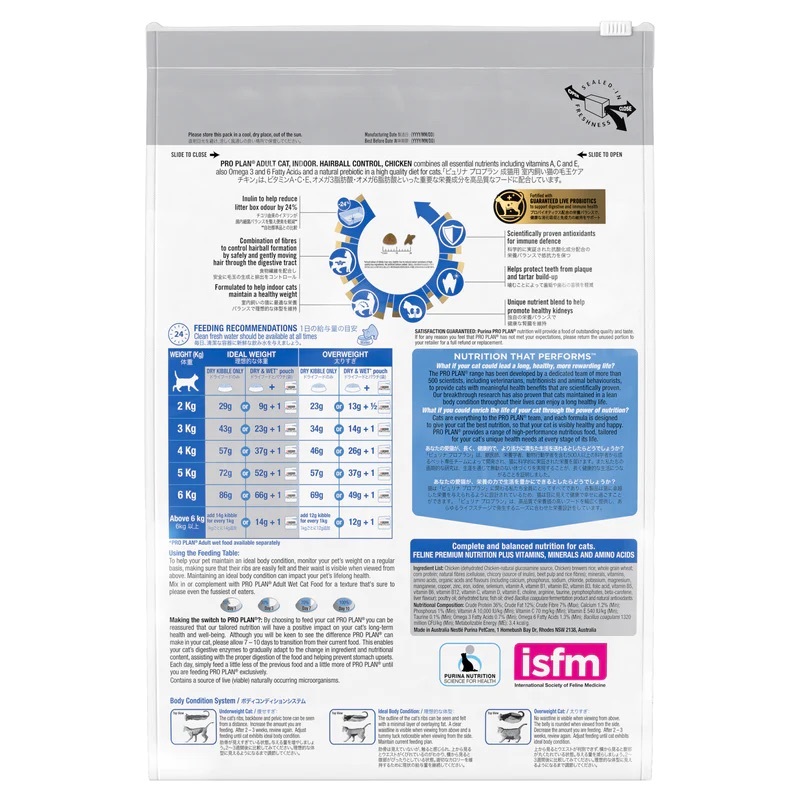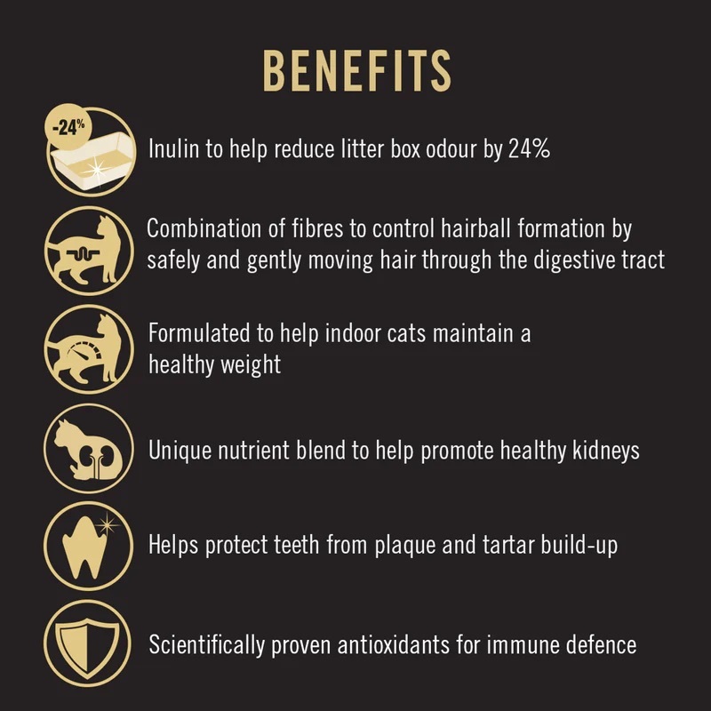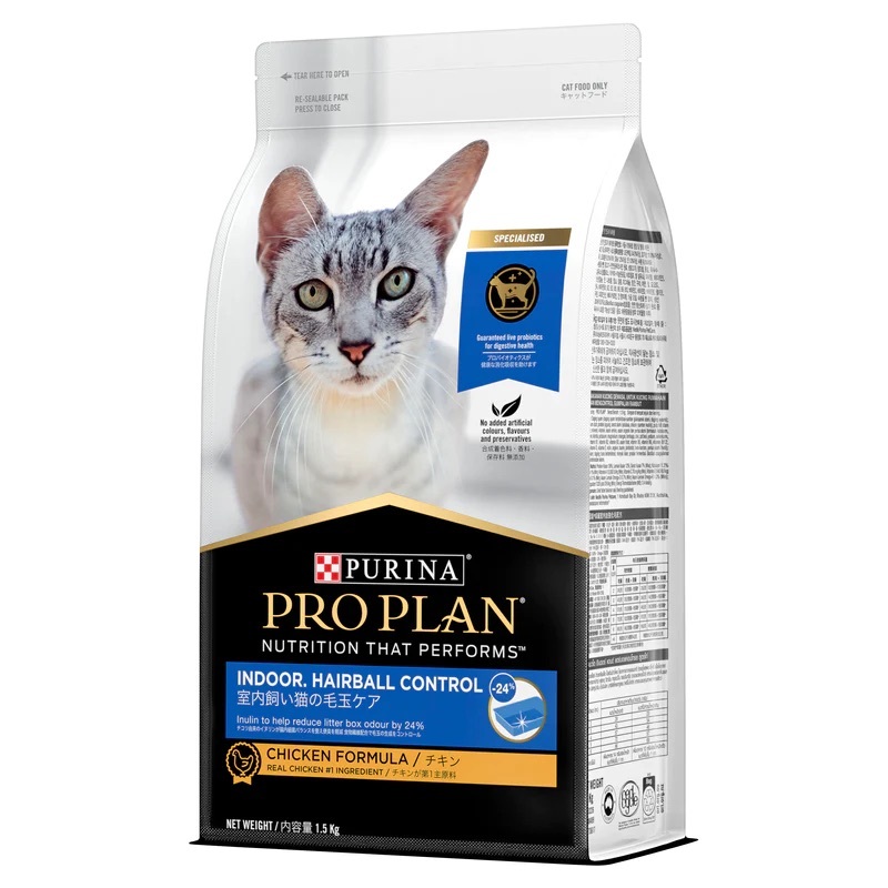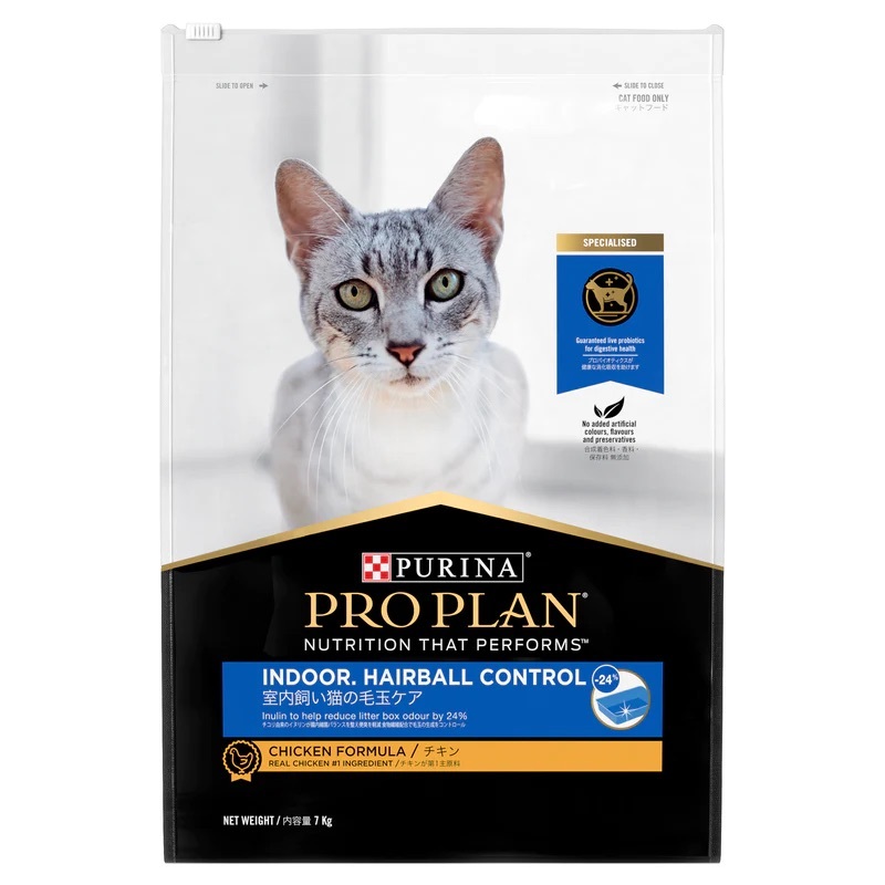 特色及詳情- 含活性益生菌,支援消化及免疫健康- 菊糖有助於減少排泄物異味減少了24%- 含多種纖維,有效控制毛球形成,安全及溫和地通過消化道去除毛髮- 配方有助室內成貓維持健康體重- 獨特營養配方,幫助促進腎臟健康- 幫助保護牙齒,防止牙菌斑及牙垢形成- 含抗氧化物,增強免疫力- 無添加人造色素、香料及防腐劑- 全面均衡營養膳食配方- 真正雞肉為第一食材