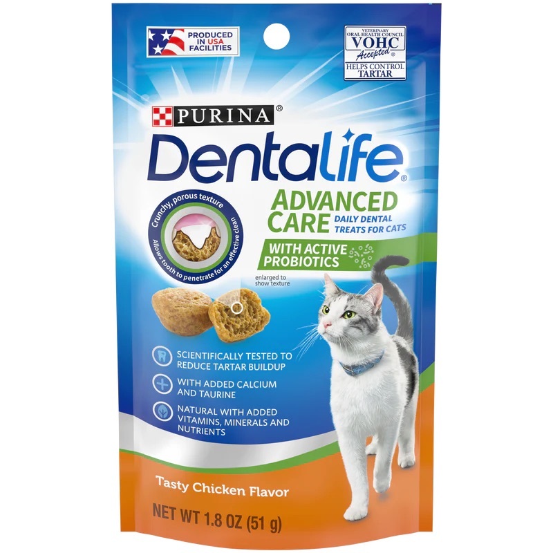 PURINA®️ Dentalife®️ 全新潔齒貓小食,添加活性益生菌,有效支持消化系統健康,有助提升免疫力。經VOHC認證,能高效潔齒並減少牙石積聚。獨有的鬆脆氣孔設計,其鬆脆氣孔能磨擦牙齒,有效去除口腔裏面的牙垢。增添鈣質和牛磺酸,以及天然維生素、礦物質和營養素等健康成分。美味可口,備有兩種口味: 三文魚及雞肉供愛貓選擇。