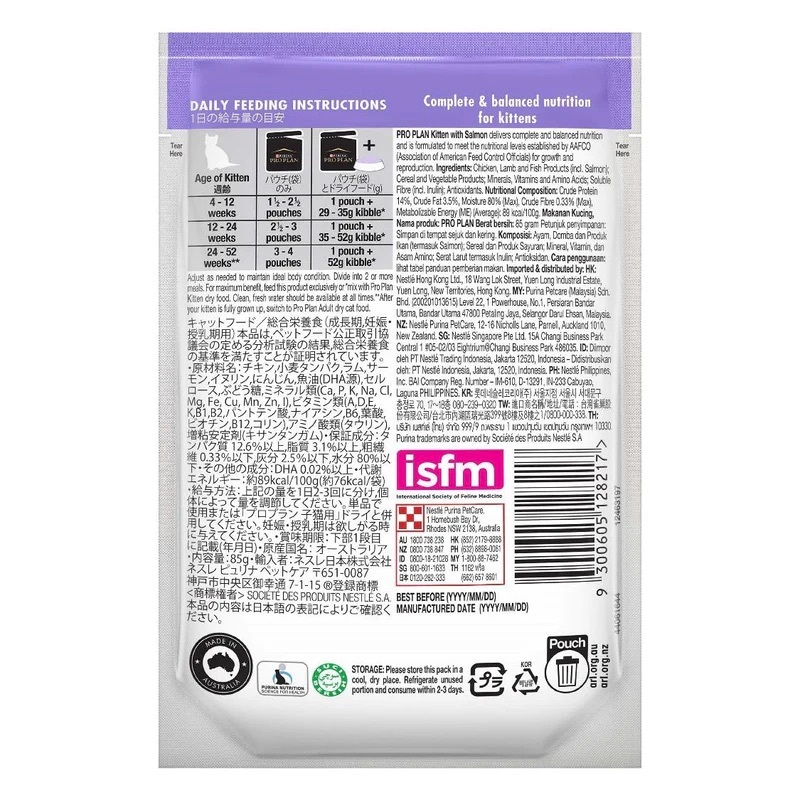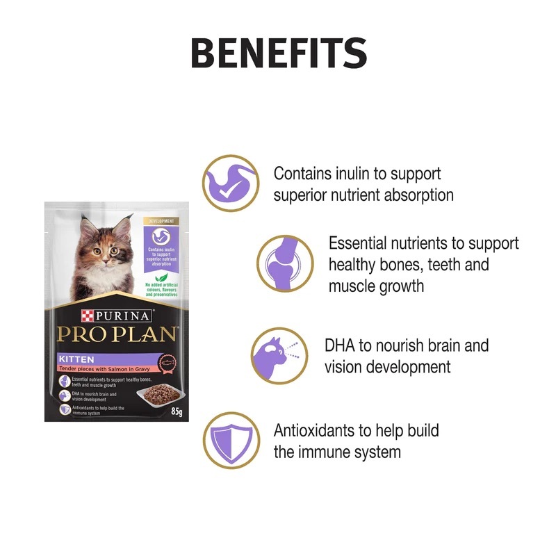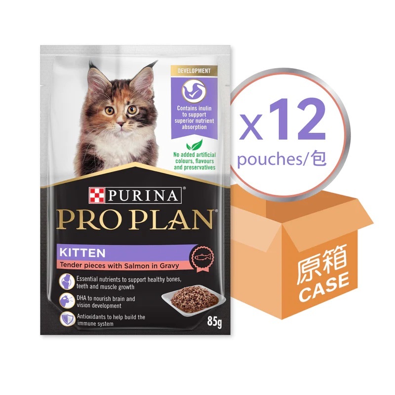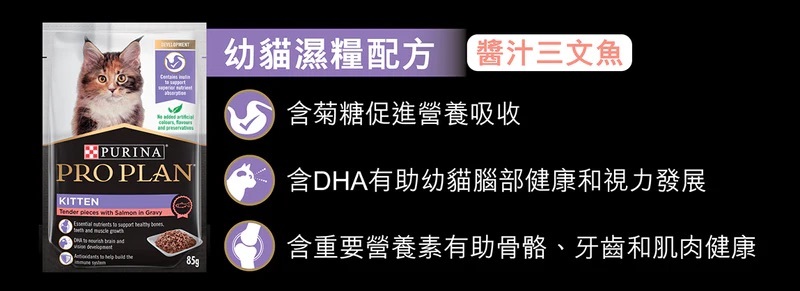 PURINA PRO PLAN 幼貓配方濕糧(醬汁三文魚) 85G- 含牛初乳 - 幫助發展健康免疫系統- 含DHA,支持腦部發展- 支持健康骨骼、牙齒及肌肉成長- 讓毛髮絲滑有光澤- 含抗氧化物,增強免疫力- 無添加人造色素、香料及防腐劑- 全面均衡營養膳食配方- 真正雞肉為第一食材