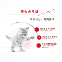 - 生長期是幼貓生命中的重要階段,在此階段幼貓將逐步經歷重大變化,探索周圍環境,發掘新鮮事物,此時免疫系統也逐漸發育。幼貓配方糧特別添加含維生素E的專利抗氧化複合物,支持幼貓第二成長階段自身抵抗力。