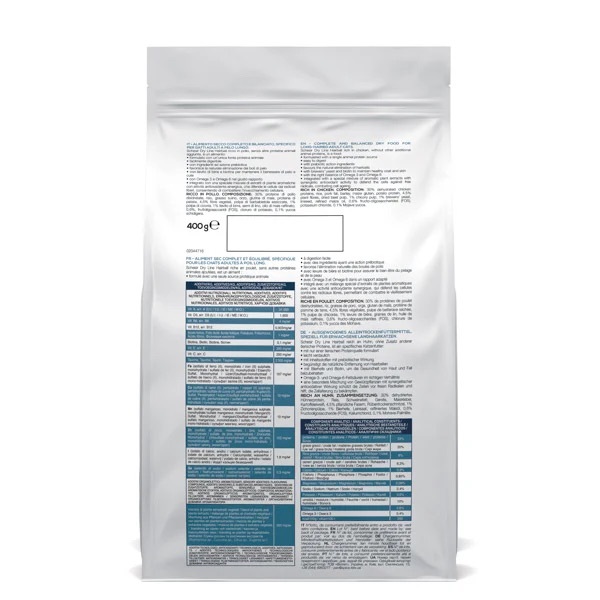 30% 脫水雞蛋白、米、豬脂肪、大麥、玉米穀膠、馬鈴薯蛋白、4.5% 植物纖維、乾甜菜漿、1% 菊苣漿、1% 啤酒酵母、亞麻籽、精製玉米油、0.6% 果寡糖 (FOS)、氯化鉀、0.1% 五味子。