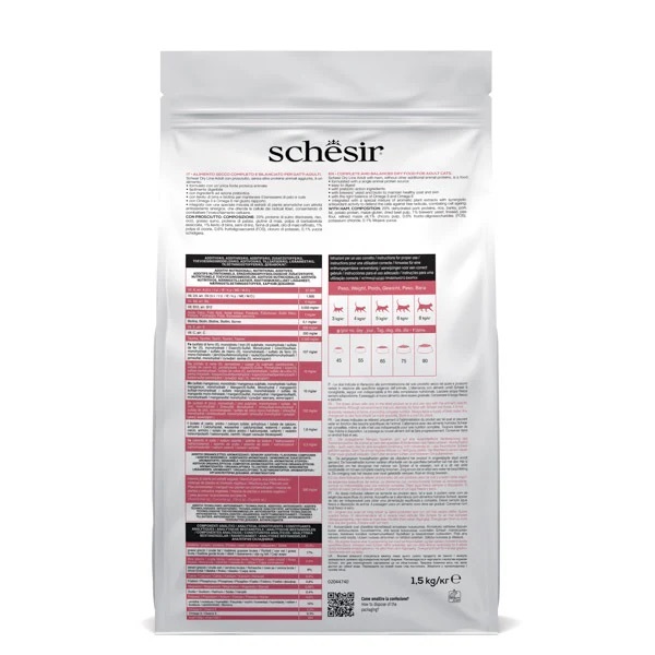以單一來源的動物蛋白質 (豬肉,其中 8% 為火腿) 配製而成,也是第一成分,是美味、易消化、營養完整且均衡的飼糧,可滿足所有品種成貓的營養需求。含生物素和啤酒酵母,有助於維持毛髮和皮膚的健康。