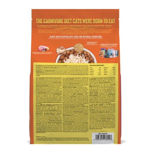 - Schesir Born Carnivore 是專為真正的肉食性動物而設的高比例動物蛋白食譜 (45%)