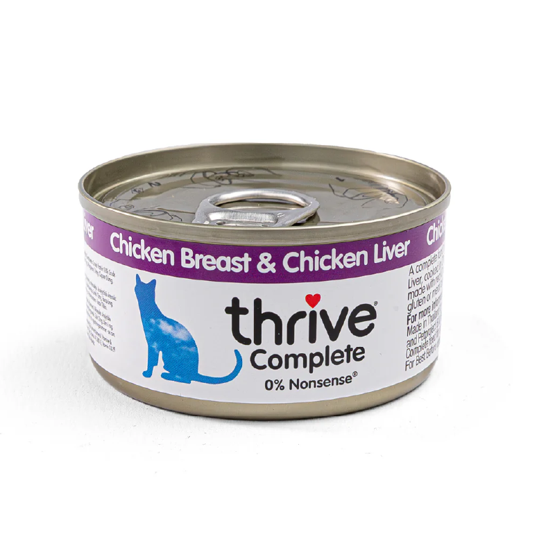 含有 75% 以上的肉類成分,以雞湯烹煮,並添加維生素和礦物質。由雞胸肉 (70%)及雞肝 (5%)製成,不含小麥/麩質,易消化,易於準備。此完整糧食可單獨餵飼或與 Thrive PremiumPlus 乾糧一起餵飼。