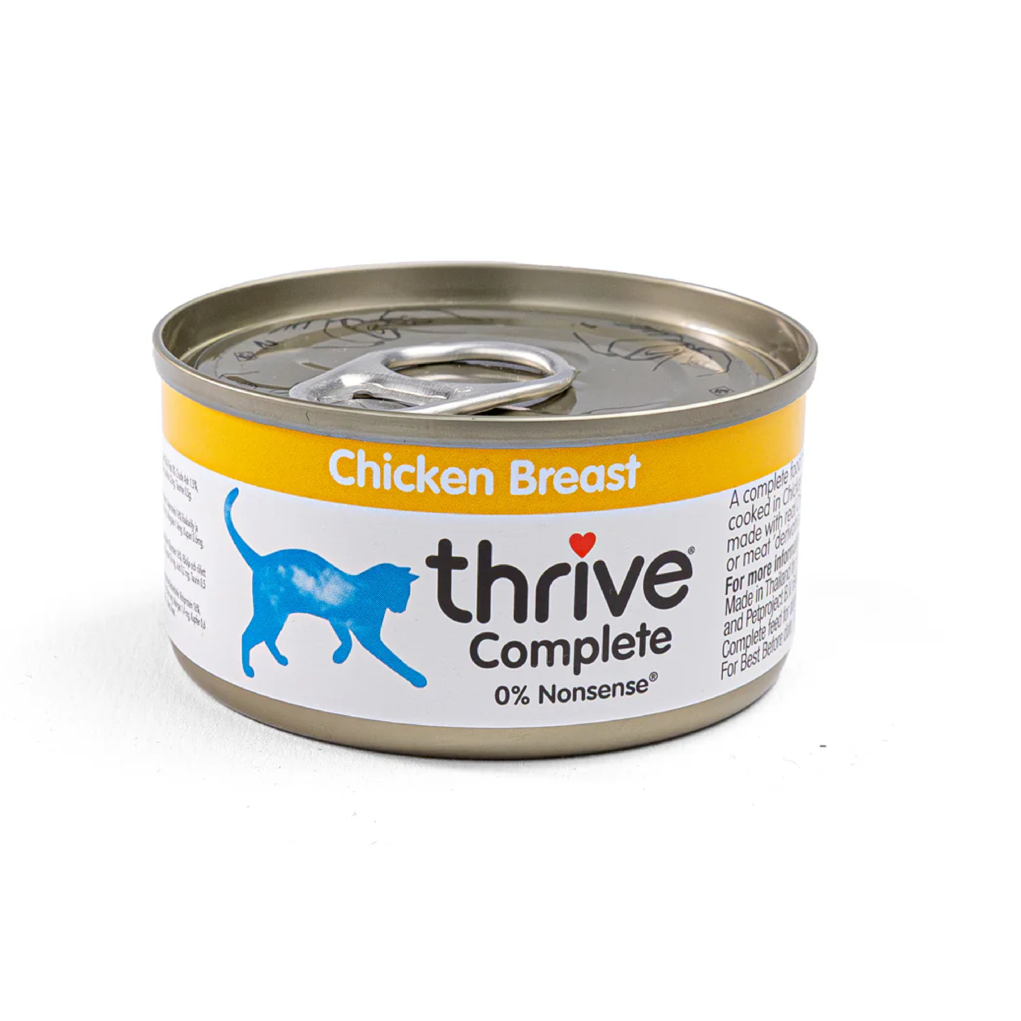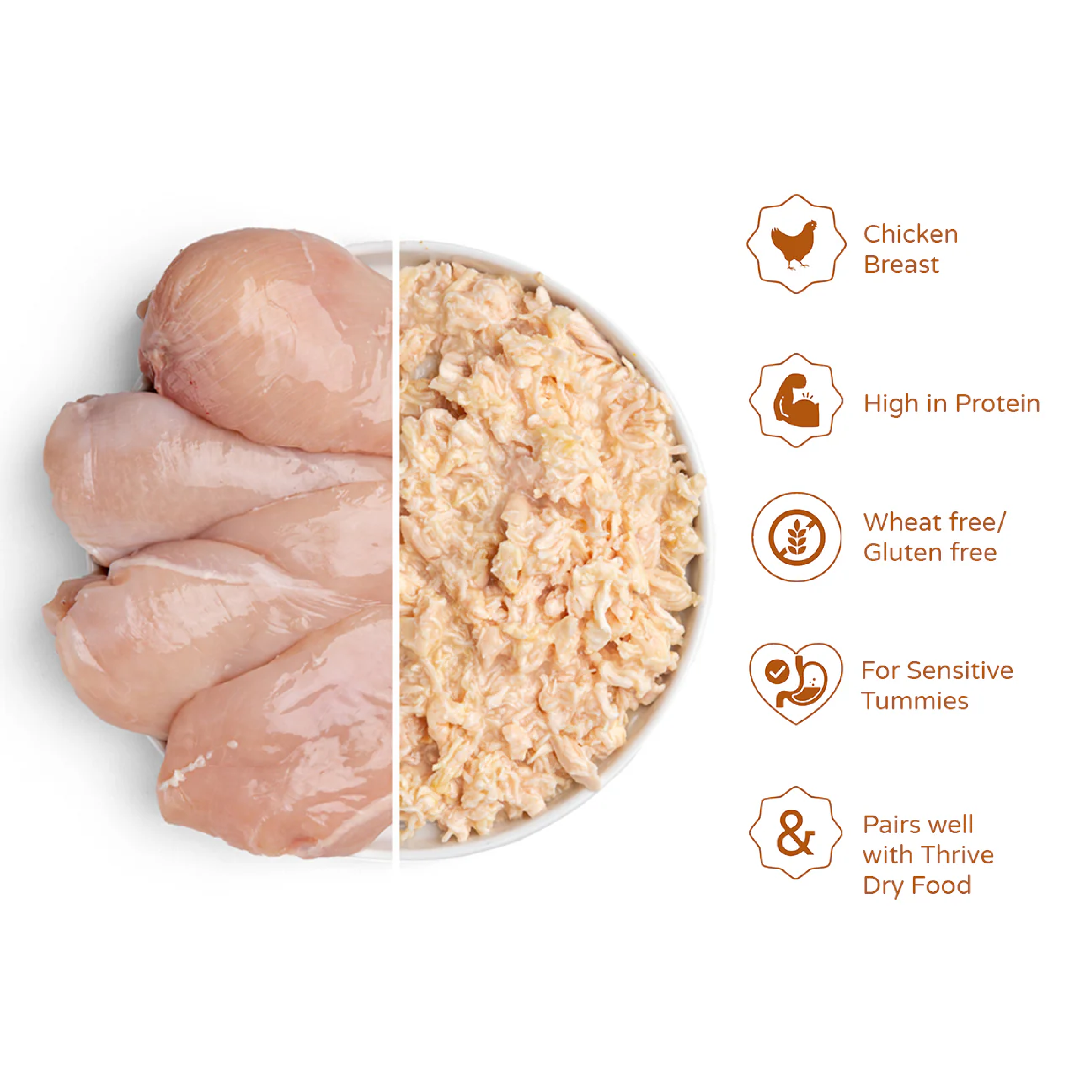 含有 75% 以上的肉類成分,以雞湯烹煮,並添加維生素和礦物質。由雞胸肉 (75%)製成,不含小麥/麩質,易消化,易於準備。此完整糧食可單獨餵飼或與 Thrive PremiumPlus 乾糧一起餵飼。