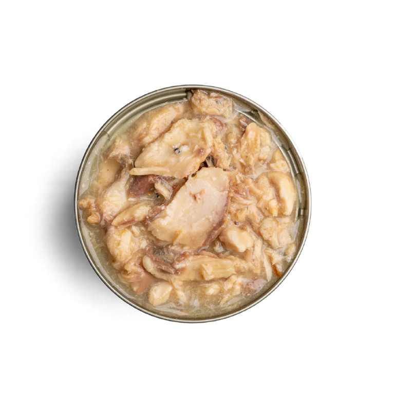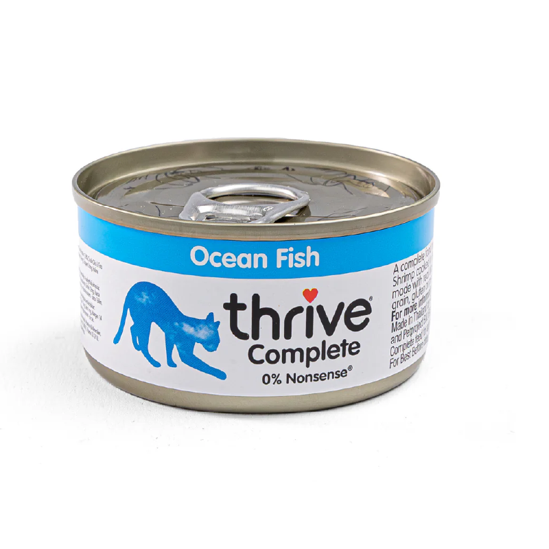 含有 75% 以上的肉類成分,以魚湯烹煮,並添加維生素和礦物質。以鯖魚 (71%)、白鮑魚 (4%)及蝦製成。不含小麥/麩質,易消化,易於準備。此完整糧食可單獨餵飼或與 Thrive PremiumPlus 乾糧一起餵飼。