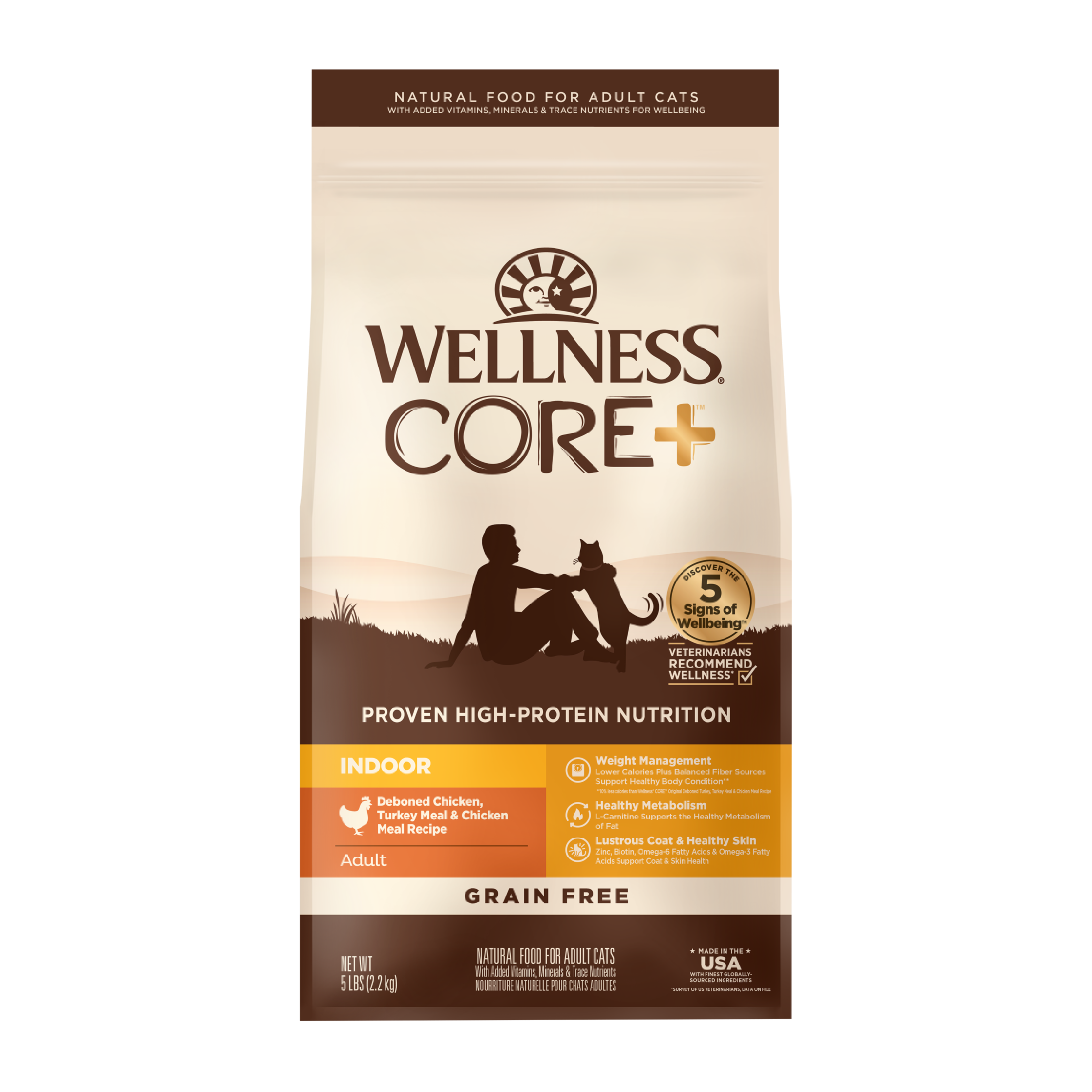 CORE無穀系列適口性極佳,所以您的貓可能吃得更多。先觀察,看是否需要調整規律的飲食模式。隨時提供您的貓乾淨、涼爽的水並盡可能搭配Wellness寵物健康 CORE無穀系列罐頭食品,以增加貓在飲食中攝取的水量。營養僅是食譜中的一部分!一定要給您的貓充分的愛,充足的運動以及定期看獸醫以幫助確保整體的健康。