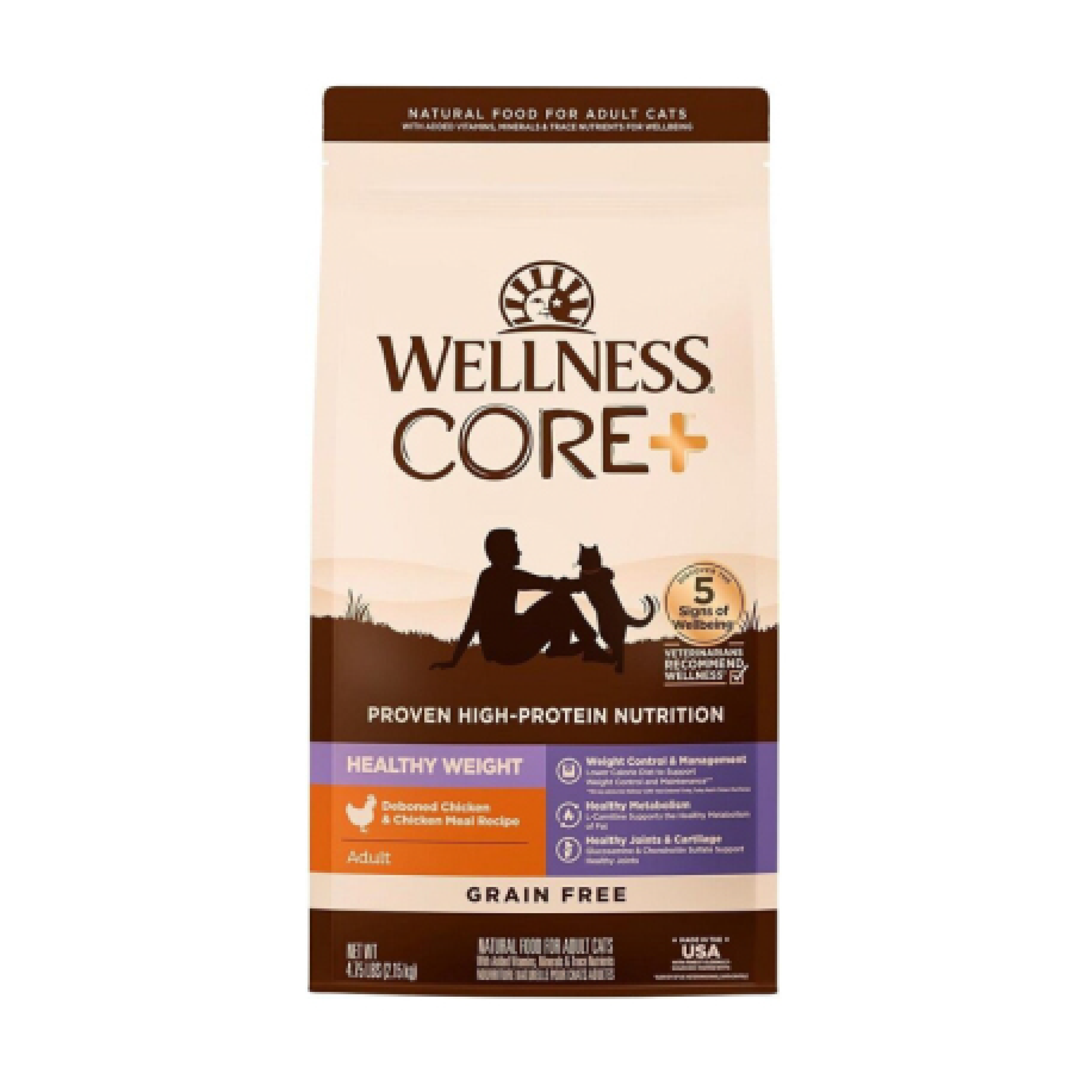 Wellness CORE+ 體重管理配方專為貓咪設計,提供經科學證實的高蛋白天然營養,以高品質成分支持貓咪的全身健康。這款配方不僅滿足五大健康指標,還特別針對體重控制需求,加入左旋肉鹼,幫助健康的脂肪代謝與體重管理。 這款貓糧採用去骨雞肉與火雞粉為主要蛋白質來源,配合無穀物的營養豐富配方,特別適合對穀物敏感的貓咪。不含肉類副產品、小麥、玉米及人工防腐劑與色素,為你的愛貓提供每一餐安心與健康的保障。